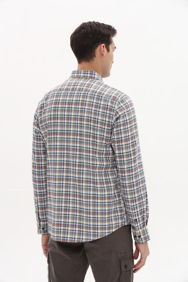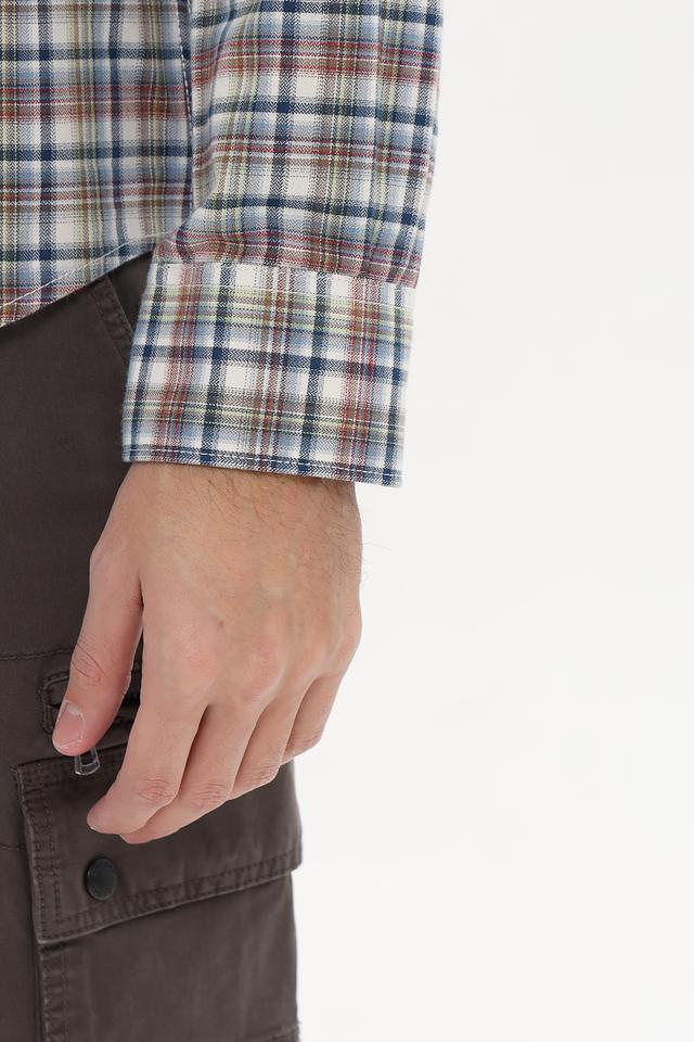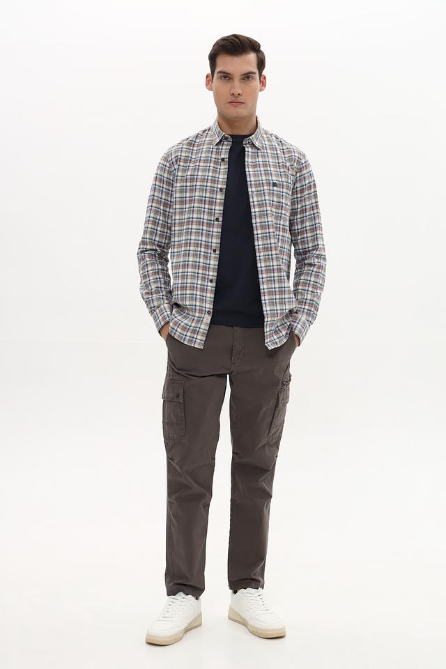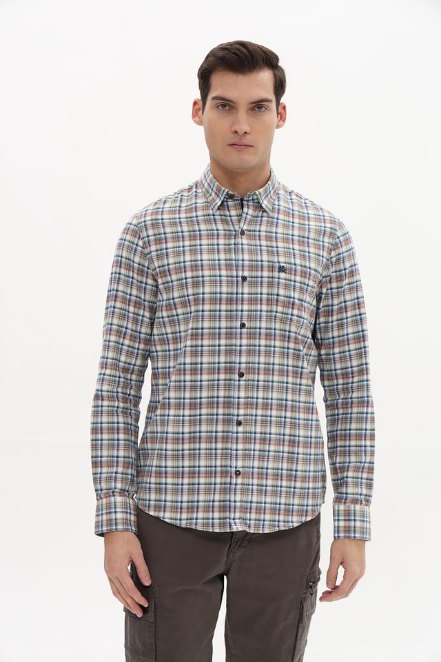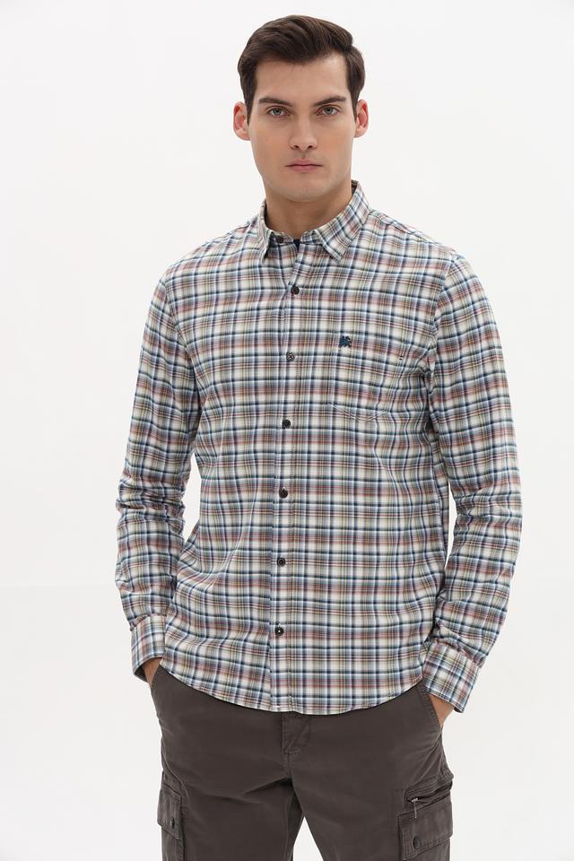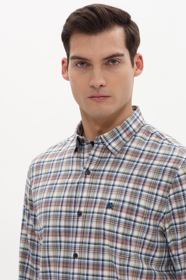Рубашка имеет классический крой, длинные рукава и традиционную застежку на пуговицы. Особенностью данной модели является яркий клетчатый принт, сочетающий в себе оттенки белого, коричневого, синего и бежевого. Небольшой логотип бренда размещен на нагрудном кармане.