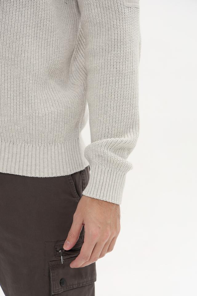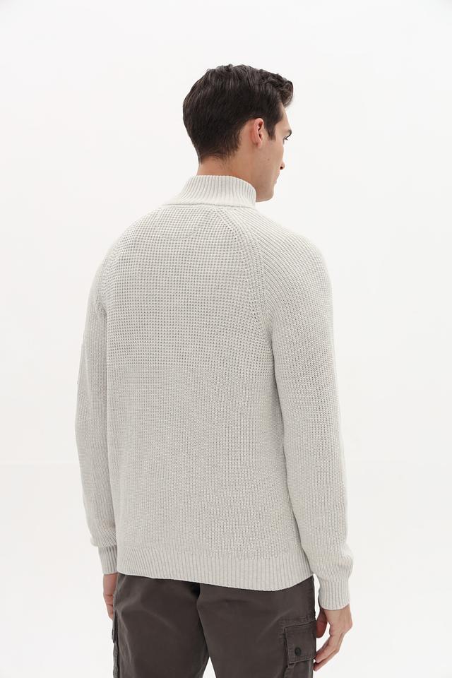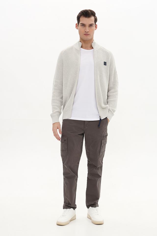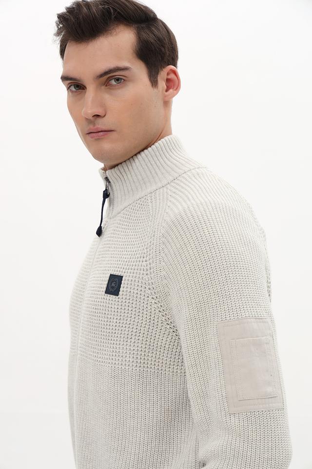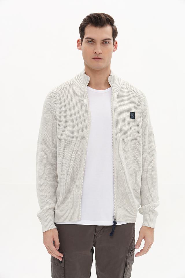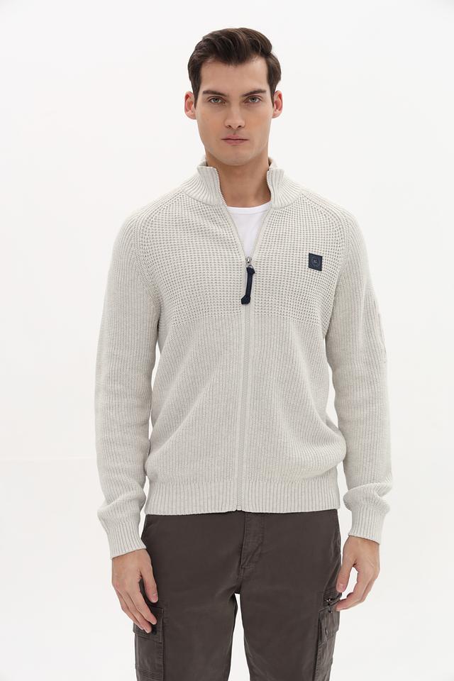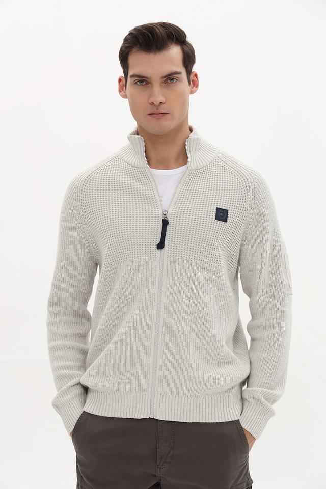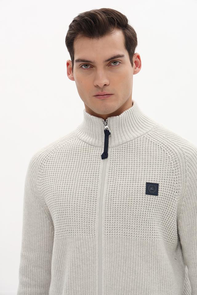 Кардиган имеет светло-серый цвет и застегивается на молнию. Воротник – стойка. На левой стороне груди расположен декоративный патч с логотипом бренда. Рукава длинные, манжеты и нижний край выполнены резинкой.