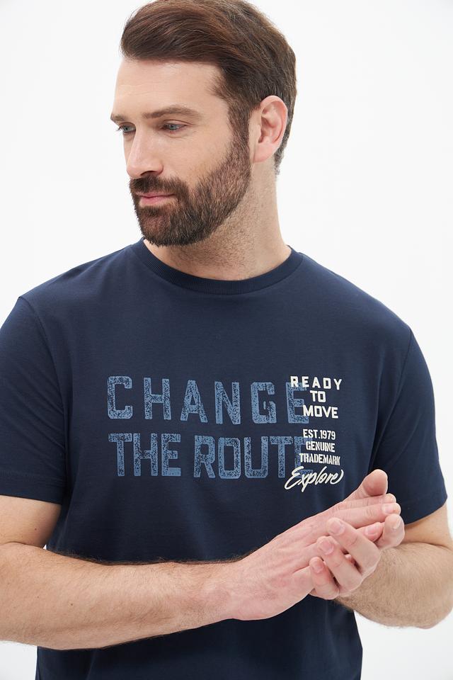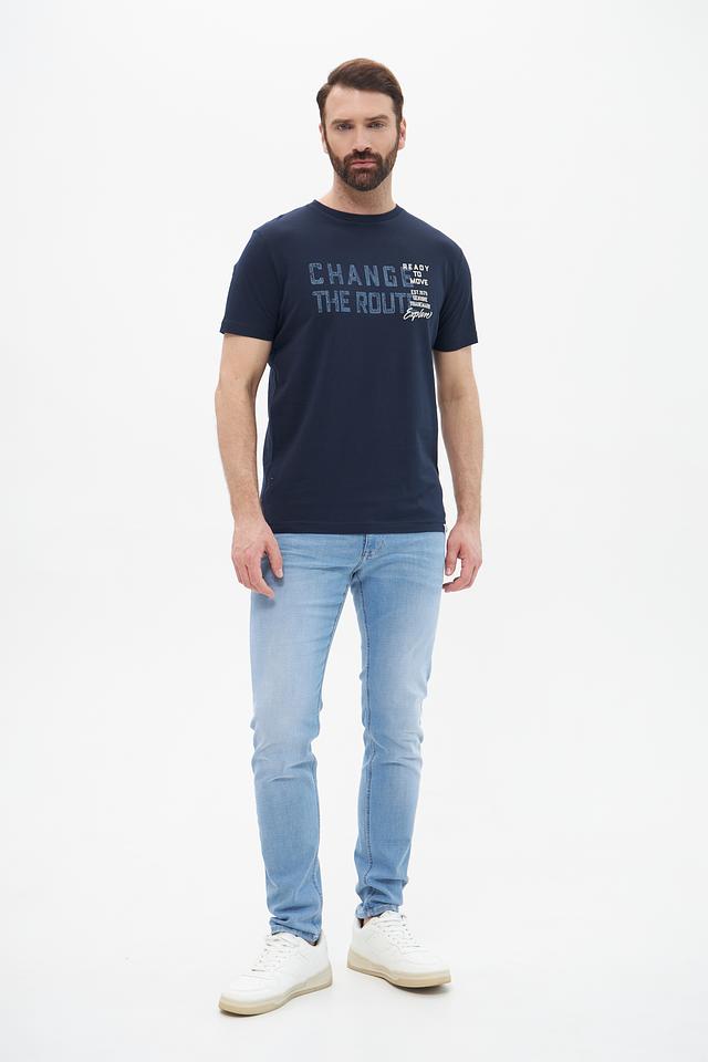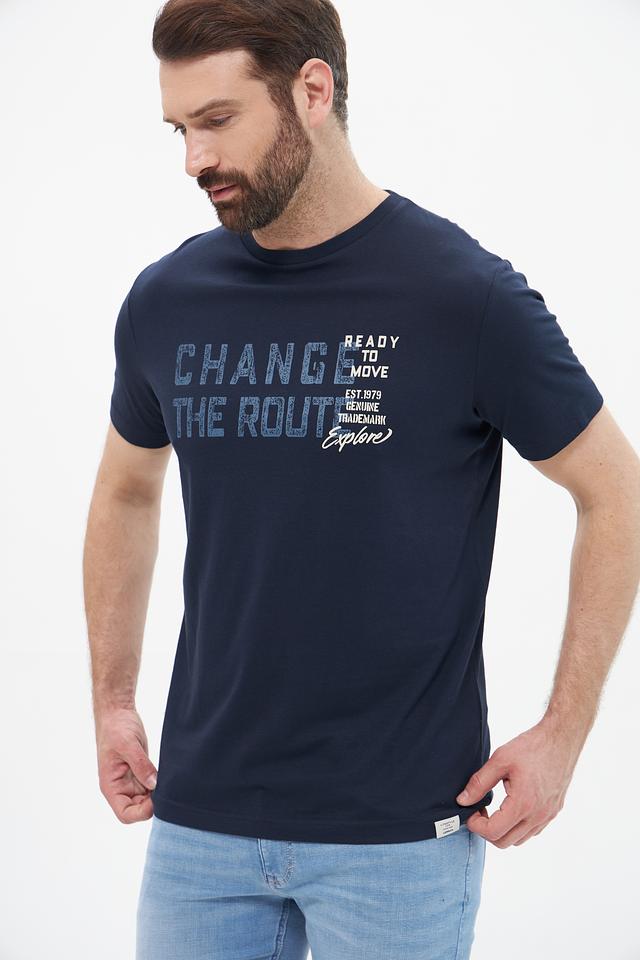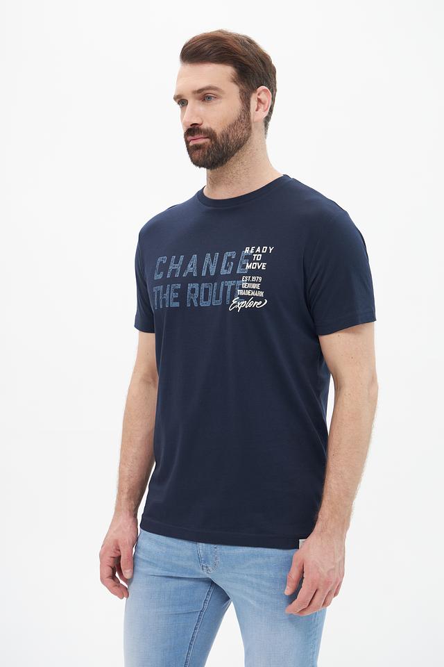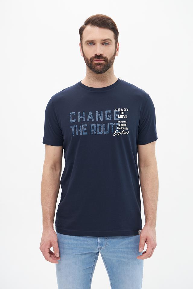 Основным акцентом является яркий принт на передней части, выполненный в серо-белой гамме с надписью "CHANGE THE ROUTE" и дополнительными элементами дизайна. Футболка имеет круглый вырез горловины и короткие рукава, что делает ее идеальным выбором для теплой погоды.
