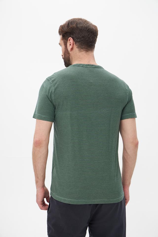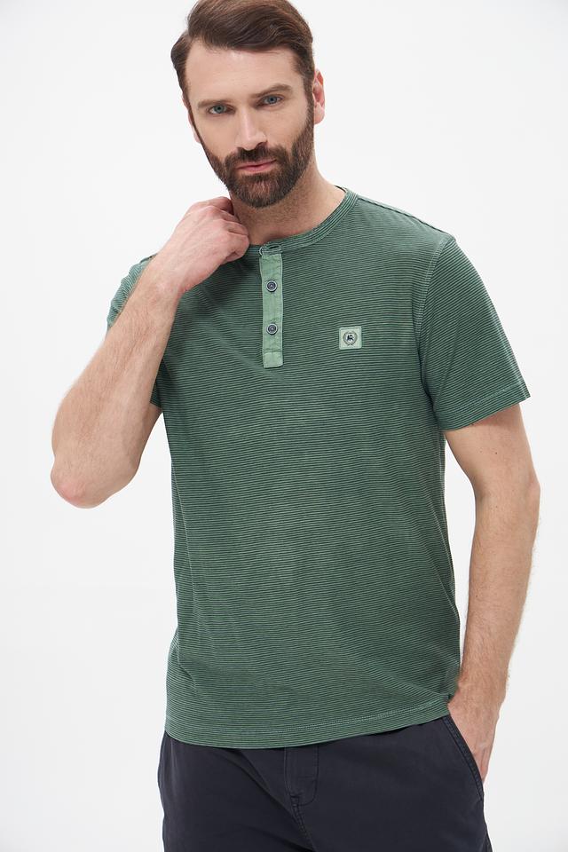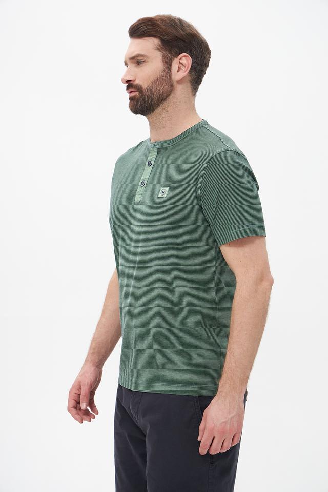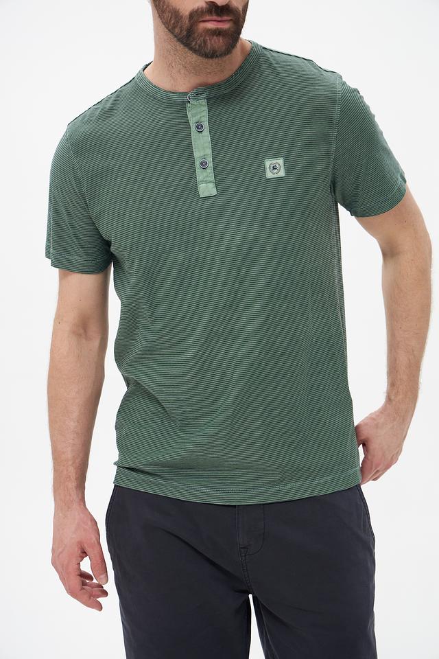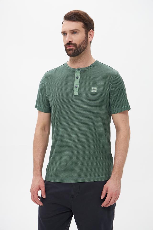 Мужская футболка Lerros зеленого цвета с коротким рукавом и полосатым рисунком. Модель выполнена с круглым вырезом горловины и застежкой на три пуговицы. Изготовлена из 100% хлопка. Состав: хлопок 100%