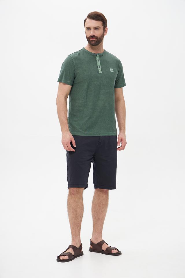 Модель имеет круглый вырез горловины, который дополнен планкой с тремя пуговицами. Короткие рукава обеспечивают свободу движений в теплую погоду. Футболка выполнена из 100% хлопка, что гарантирует приятные тактильные ощущения и комфорт при носке.