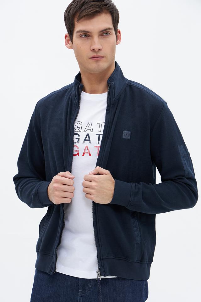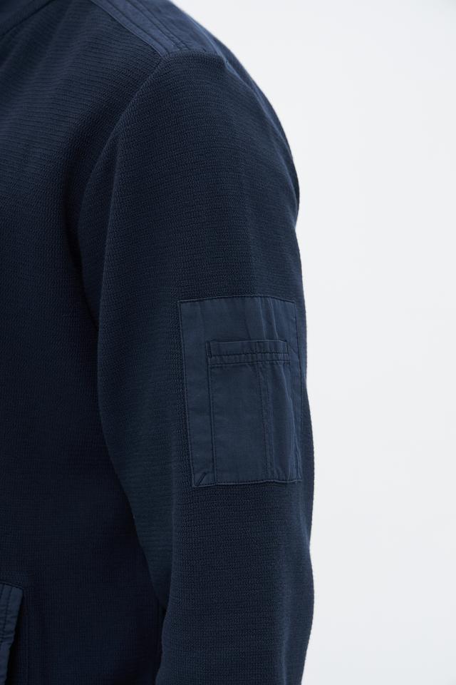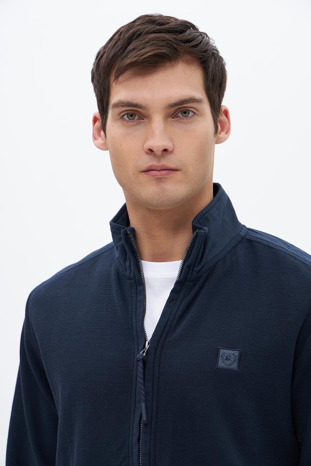 Кардиган имеет удобную застёжку на молнии, воротник-стойку и манжеты на рукавах. Декоративные вставки на плечах и нагрудном кармане придают изделию стильный и современный вид.