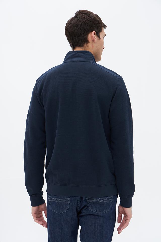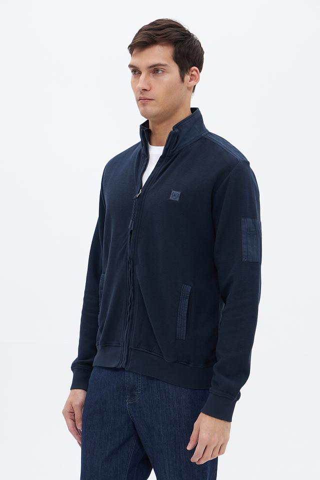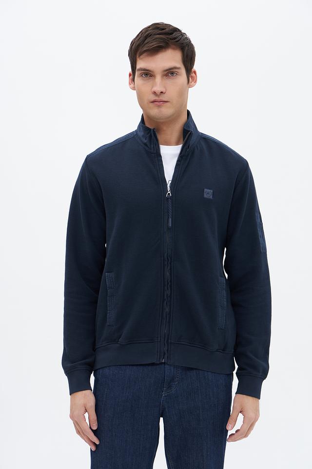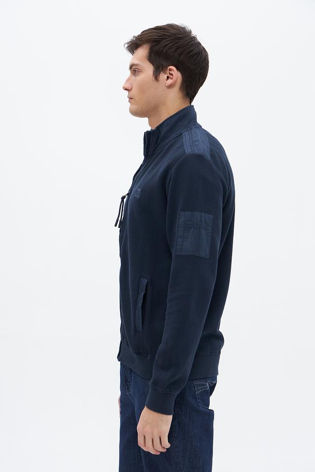 Мужской кардиган Lerros тёмно-синего цвета – удобная и стильная модель на молнии. Изготовлен из мягкого хлопка, имеет декоративные вставки на плечах и нагрудном кармане. Идеально подходит для создания повседневных образов. Состав: хлопок 100%
