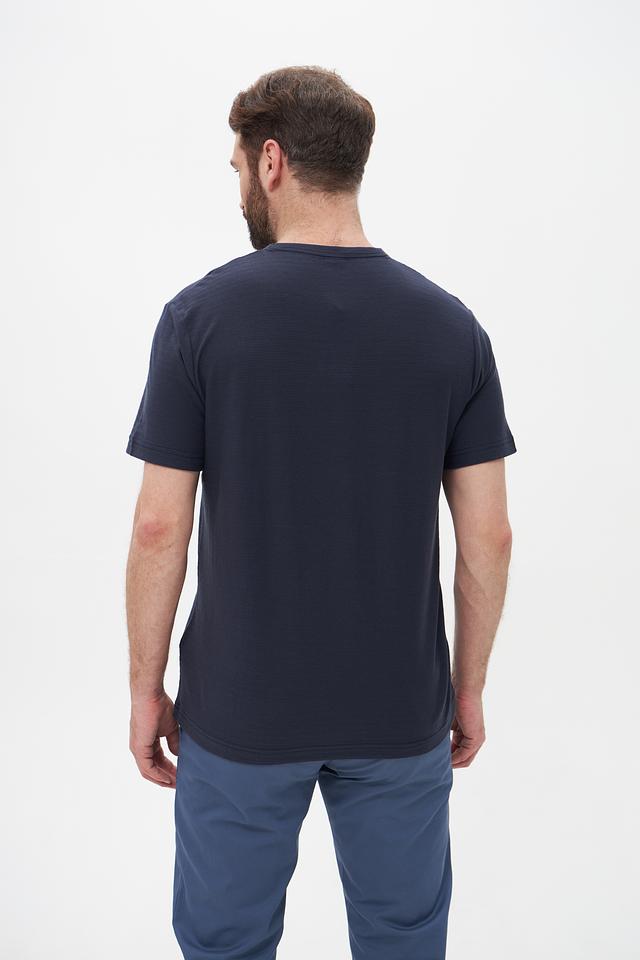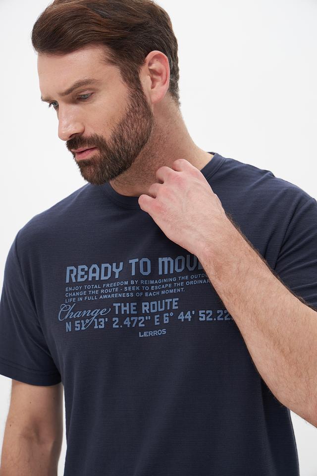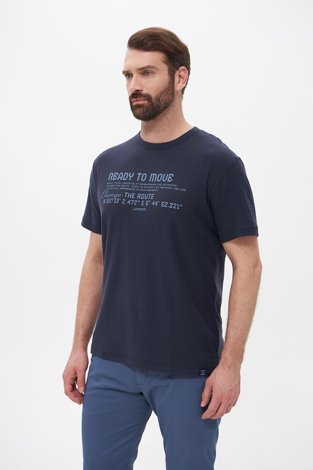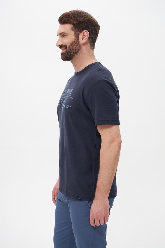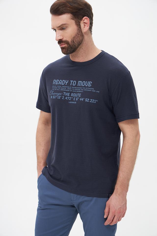 Эта мужская футболка от Lerros станет отличным дополнением к вашему гардеробу. Выполнена в насыщенном синем цвете, она привлекает внимание оригинальным принтом с надписями и географическими координатами.