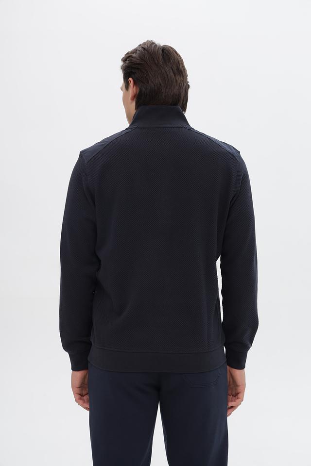 Джемпер отличается оригинальной текстурой в виде мелкой ячеистой сетки, которая придает изделию особый шарм. Короткая молния на горловине позволяет регулировать степень открытости выреза. На груди расположен небольшой логотип бренда.
