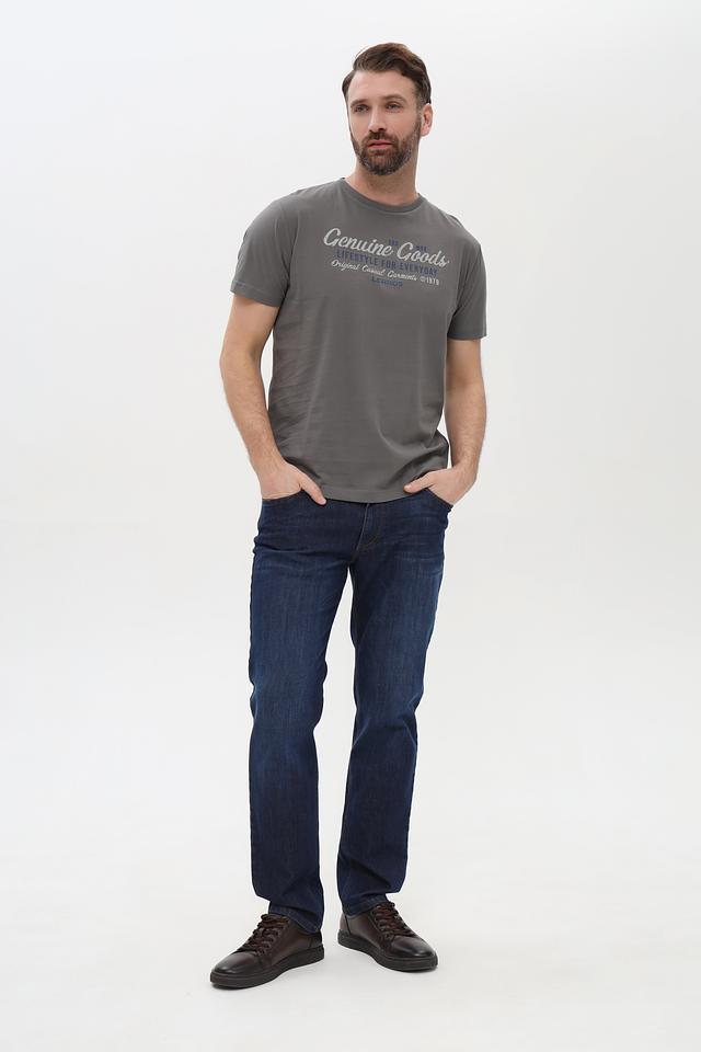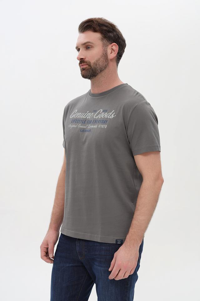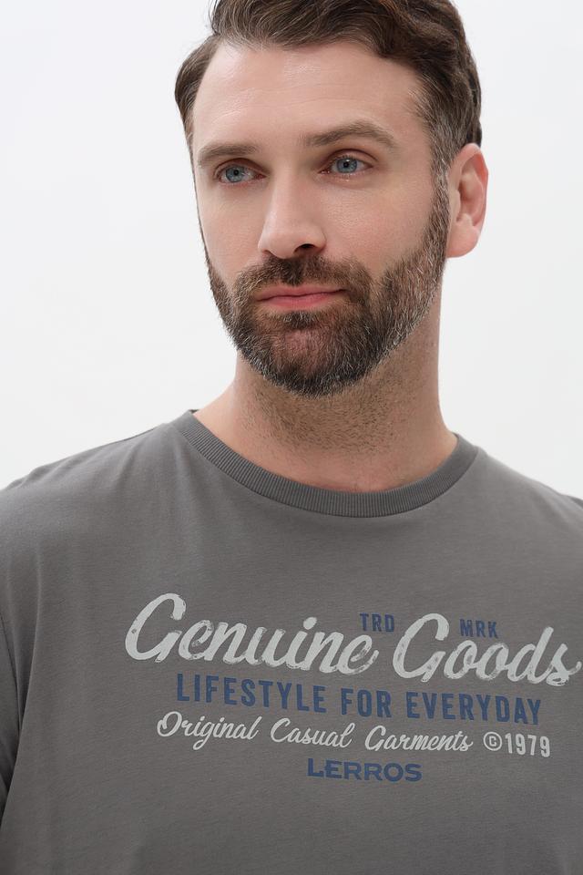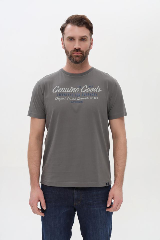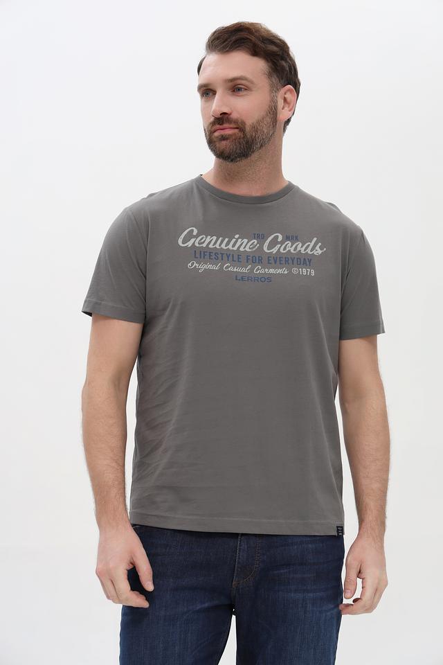 Представляем стильную мужскую футболку от бренда Lerros. Эта футболка выполнена в сером цвете и украшена эффектным принтом "Genuine Goods", который придает ей индивидуальность.