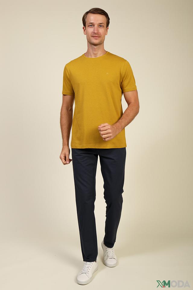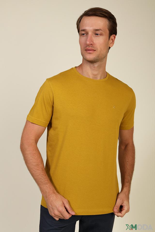Цвет футболки – насыщенный горчичный, который отлично сочетается с различными оттенками и стилями одежды. На груди расположена небольшая вышивка с логотипом бренда, добавляющая футболке индивидуальности.