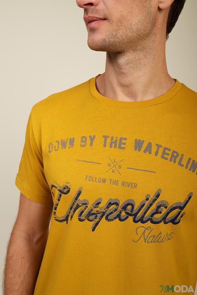 Основной цвет футболки – горчичный, который придает ей особый шарм и универсальность. На груди расположен яркий принт с надписью "DOWN BY THE WATERLINE" и изображением, выполненным в винтажном стиле. Принт выполнен в тёмно-синих и белых тонах, что создает контрастный и привлекательный образ.