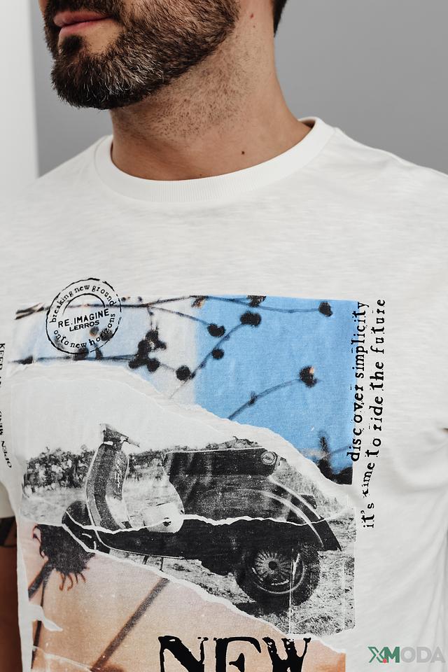 Эта стильная футболка от Lerros выполнена в белом цвете и украшена эффектным принтом с изображением автомобиля и надписью "New Horizons". Футболка имеет классический прямой крой, который подходит для любого типа фигуры.