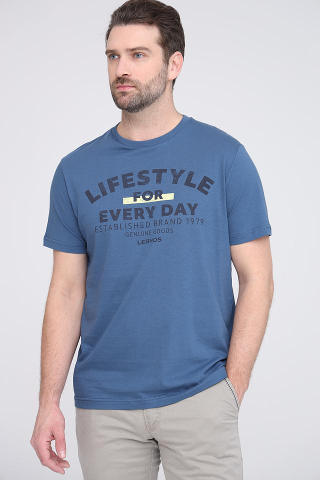 Модель имеет прямой крой, короткий рукав и классический круглый вырез горловины. Футболка украшена ярким принтом с надписью "LIFESTYLE FOR EVERY DAY", выполненным в контрастных тонах.