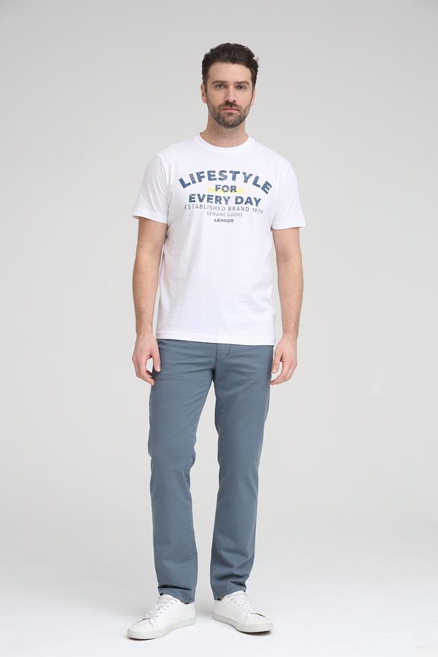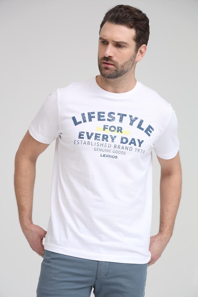 Основным элементом дизайна является яркий принт "Lifestyle for Every Day", выполненный в сине-бежевой гамме. Принт добавляет образу индивидуальность и динамичность. Крой футболки – классический, прямой, что делает ее универсальной и подходящей для разных типов фигуры.