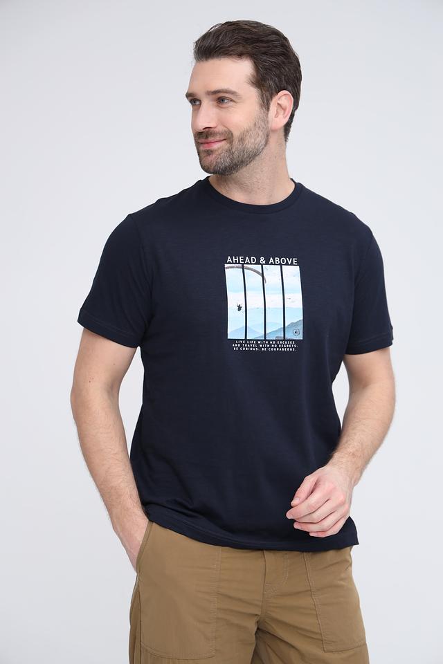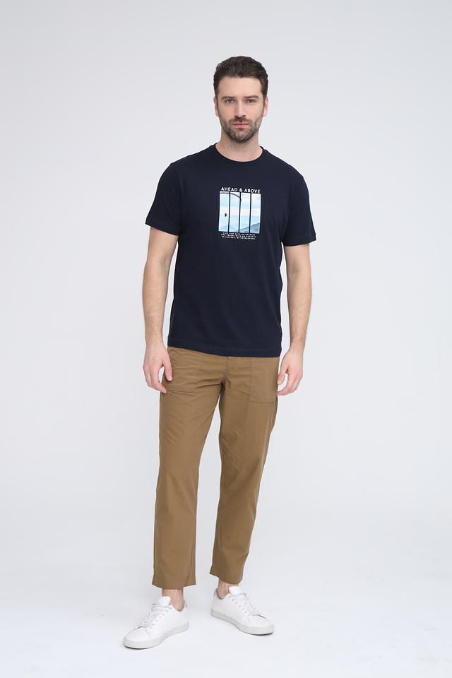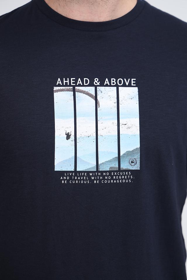 Основной цвет футболки – тёмно-синий, который отлично сочетается с различными элементами гардероба. На лицевой стороне футболки расположен яркий принт с изображением гор и надписью "AHEAD & ABOVE".