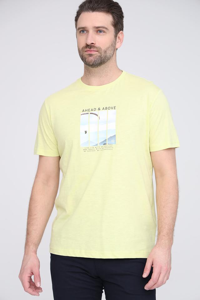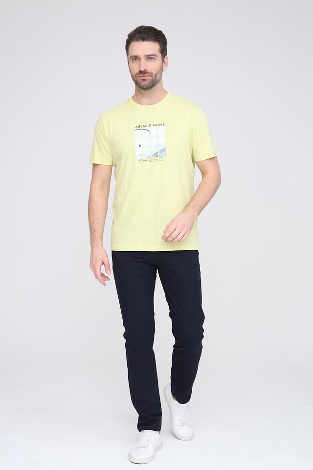 Футболка имеет классический крой и круглый вырез горловины. Главной особенностью модели является яркий лаймовый цвет и стильный принт с изображением пейзажа и надписью "AHEAD & ABOVE".