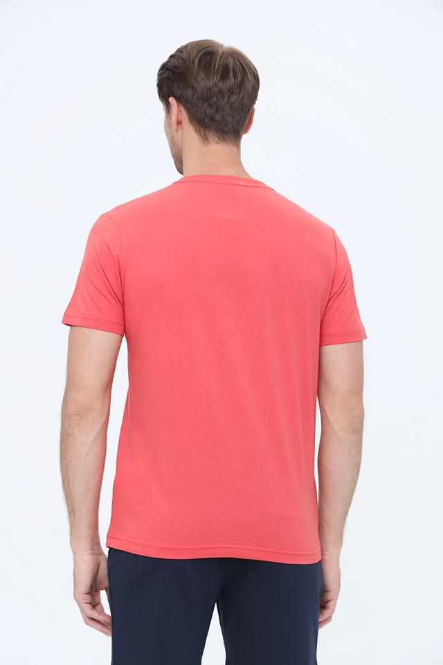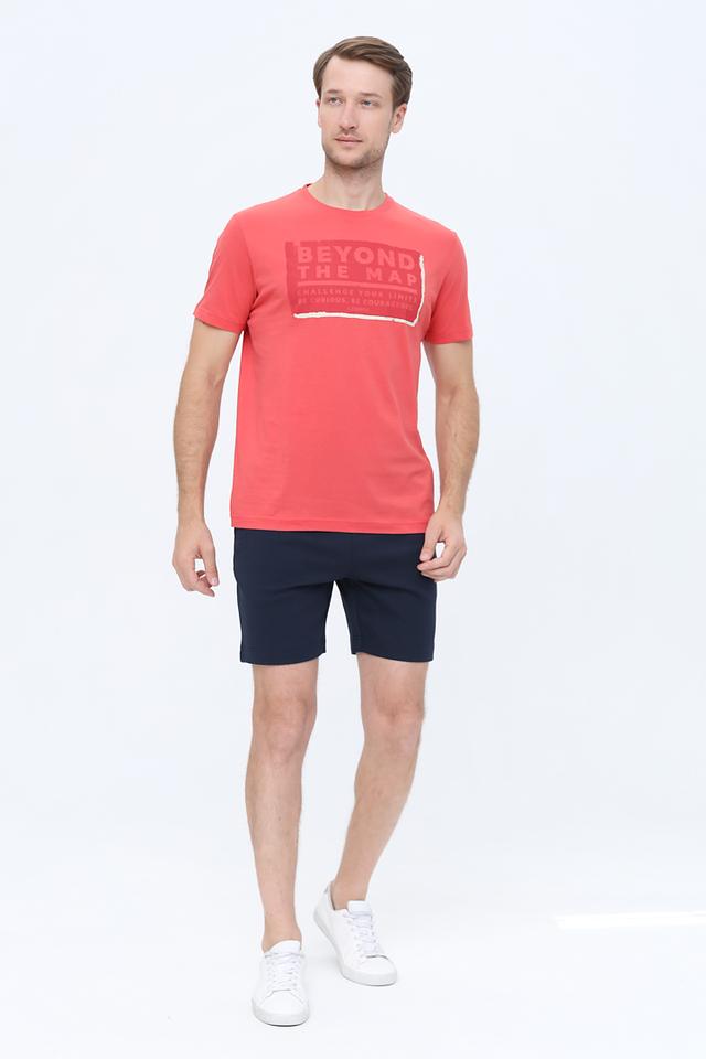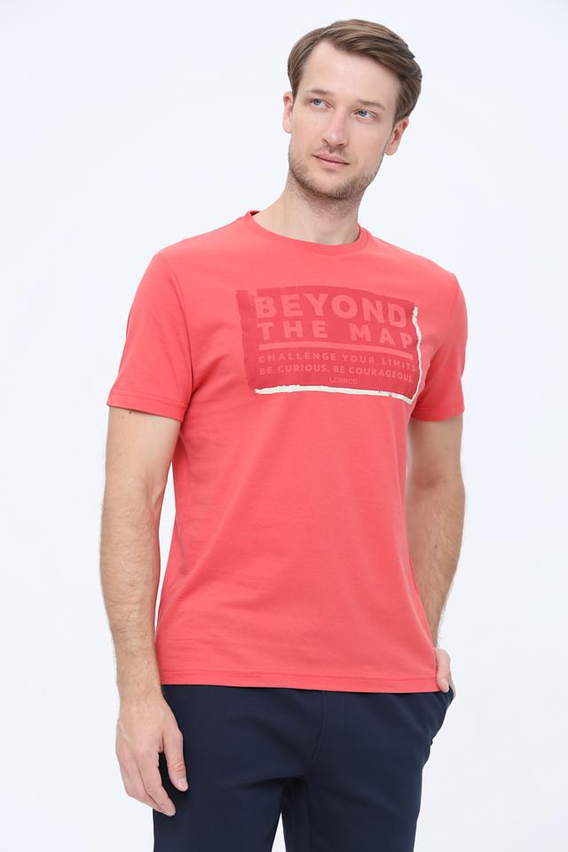Футболка имеет классический крой с короткими рукавами и круглым вырезом горловины. Главная деталь модели – яркий принт на груди с надписью "BEYOND THE MAP", который добавляет образу оригинальности и динамики. Цвет футболки – насыщенный коралловый, который отлично сочетается с различными оттенками.