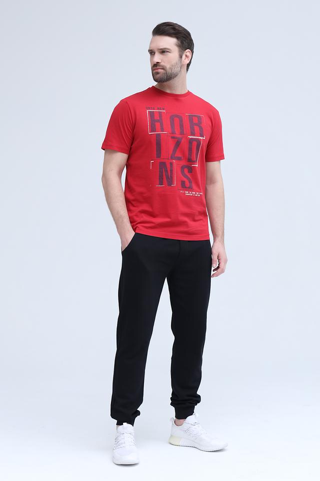 Основным акцентом является крупный графичный принт на передней части, выполненный в черном и белом цветах. Принт добавляет образу динамичности и современности. Крой футболки классический, прямой, что обеспечивает комфортную посадку по фигуре.