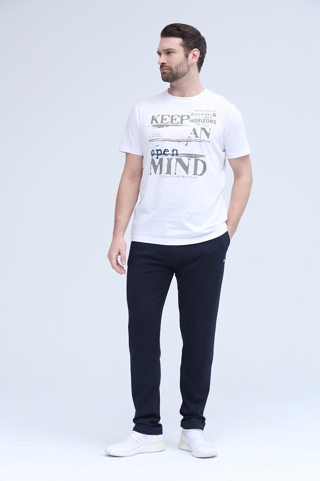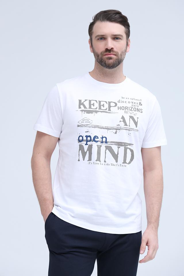 Основным элементом дизайна является яркий принт на лицевой стороне, выполненный в серо-чёрной гамме. Принт содержит надпись "KEEP AN OPEN MIND" и графические элементы, придающие футболке индивидуальность.
