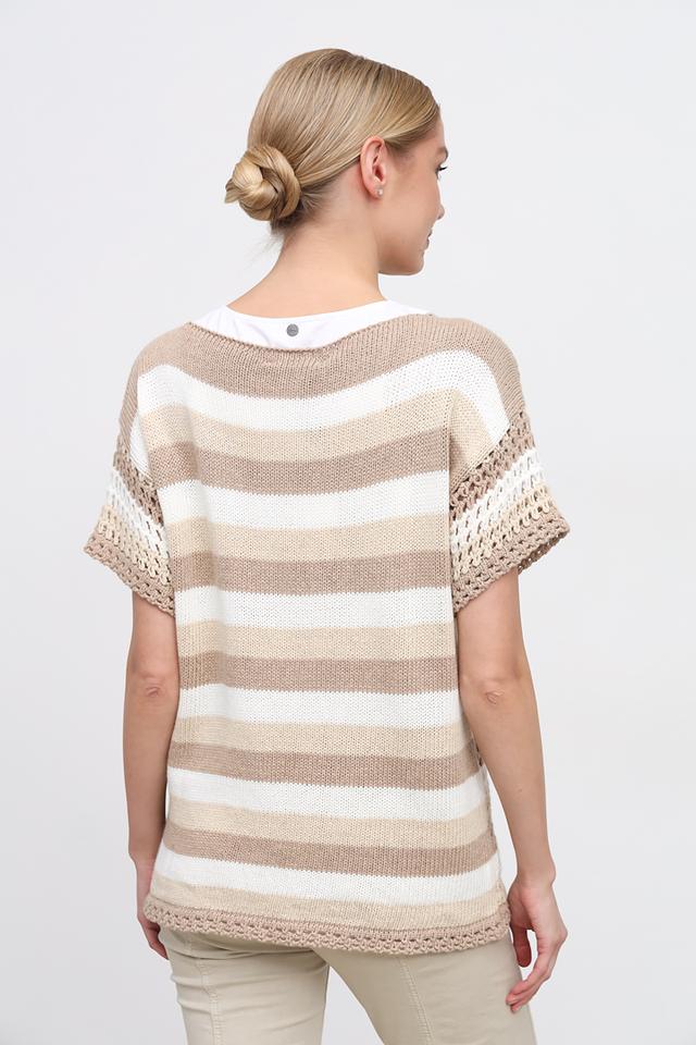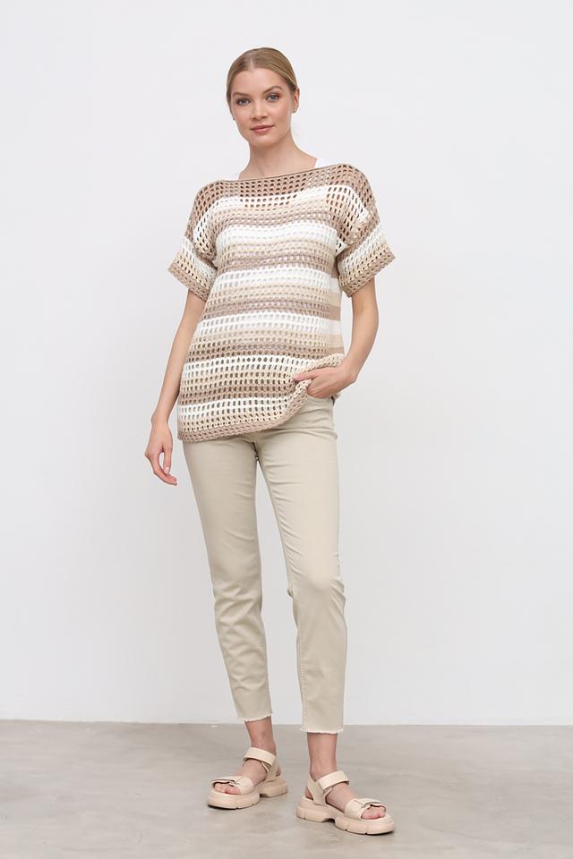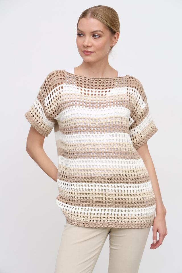Женский пуловер Lisa Campione бежевого цвета с короткими рукавами выполнен в полоску. Модель имеет свободный крой и ажурную вязку, что делает ее легкой и воздушной. Состав: хлопок 50%, акрил 50%