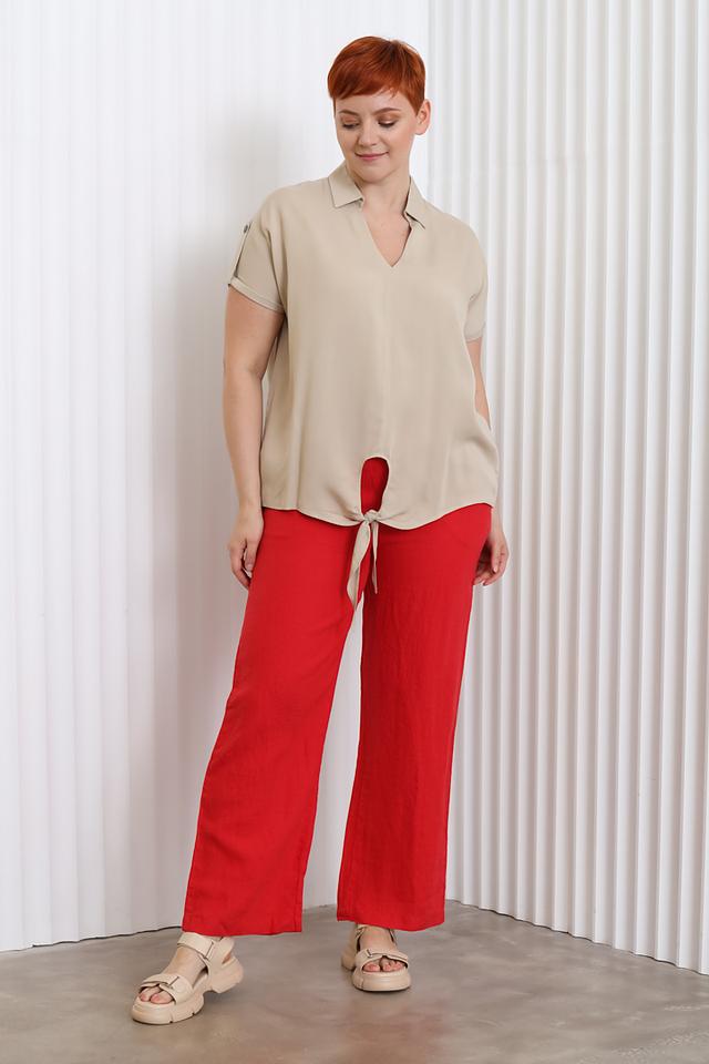 Блуза имеет свободный крой, короткие рукава и V-образный вырез, что делает ее универсальной для различных образов. Завязка на талии позволяет подчеркнуть фигуру и создать более женственный силуэт.