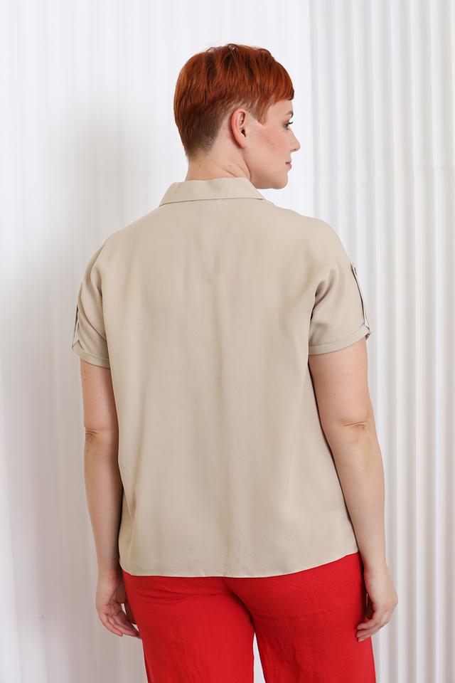 Бежевая блуза Lisa Campione из тенселя с короткими рукавами и завязкой на талии. Модель имеет воротник и V-образный вырез, а также декоративные пуговицы на рукавах. Состав: тенсель 100%