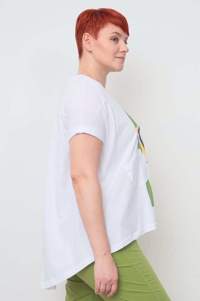 Футболка имеет свободный крой, короткие рукава и круглый вырез горловины. Небольшой карман на груди добавляет функциональности и непринужденности образу. Эта модель идеально подойдет для создания стильных и комфортных образов на каждый день.