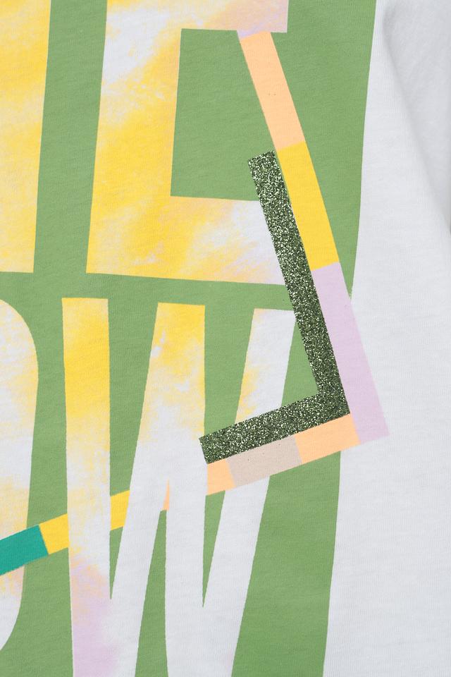 Особенностью данной футболки является яркий и запоминающийся принт "ME NOW", выполненный в сочетании зелёного, жёлтого и розового цветов. Принт расположен по центру изделия и придает ему оригинальность и индивидуальность.