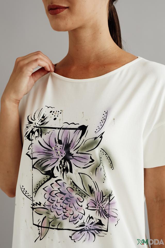 Основной цвет футболки – белый, что делает ее универсальной и легко сочетаемой с другими элементами одежды. Главная особенность модели – яркий и стильный цветочный принт, выполненный в нежных лиловых и зеленых оттенках. Принт придает футболке индивидуальность и женственность.