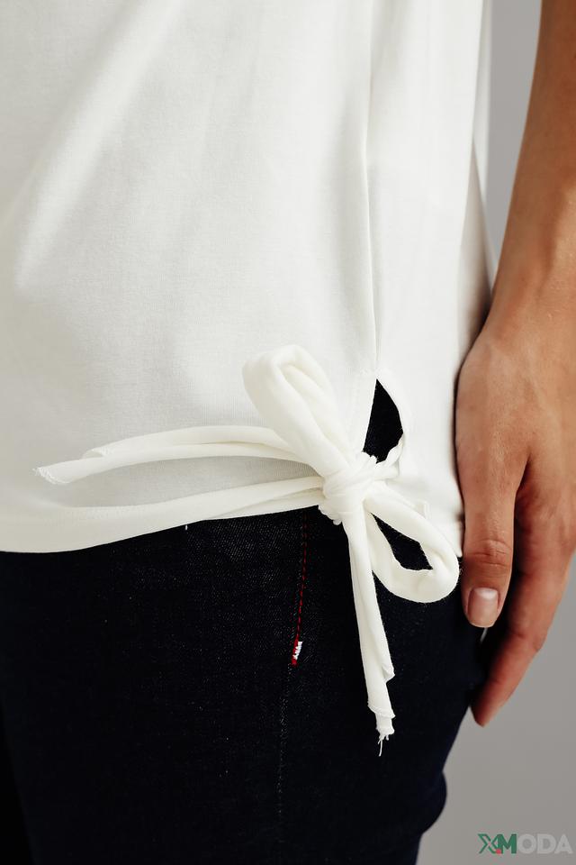 Фасон футболки – свободный, слегка заниженный, с короткими рукавами и округлым вырезом горловины. Сбоку на подоле предусмотрена небольшая декоративная завязка, которая добавляет образу игривости. Футболка идеально подходит для создания повседневных образов, а также для более интересных и стильных комбинаций.