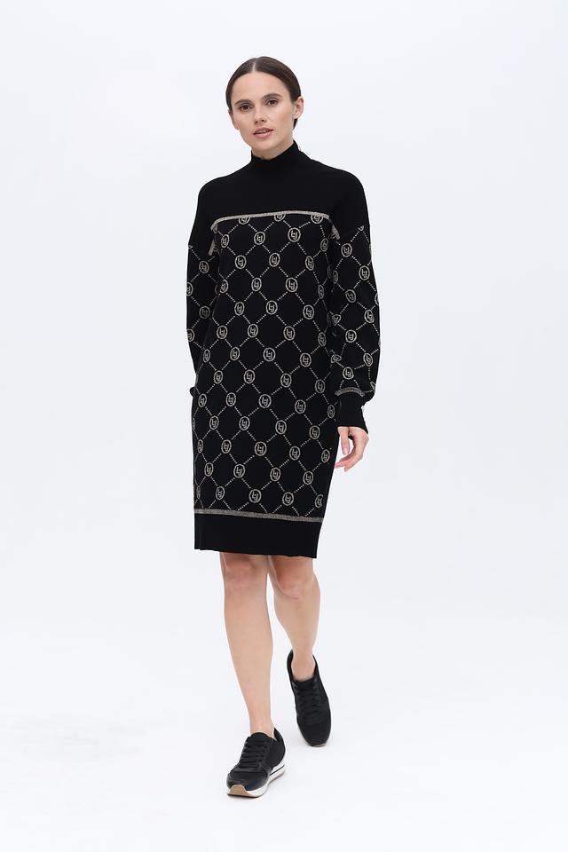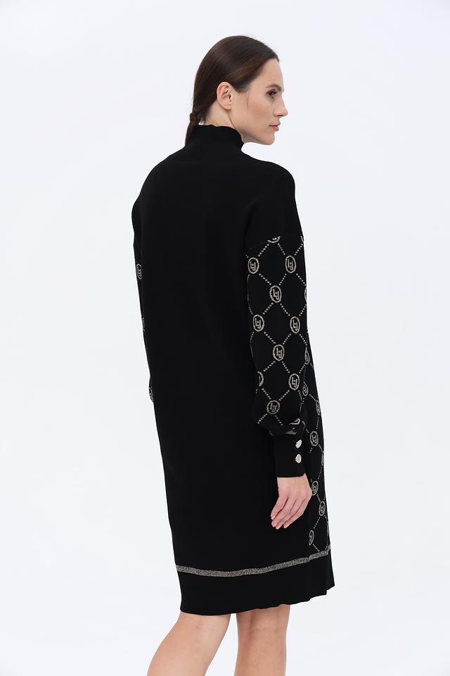 Платье имеет классический чёрный цвет, который легко сочетается с различными аксессуарами и обувью. Жаккардовый узор с логотипом бренда придает изделию изысканность и узнаваемость. Высокая горловина и длинные рукава делают платье подходящим для прохладной погоды.