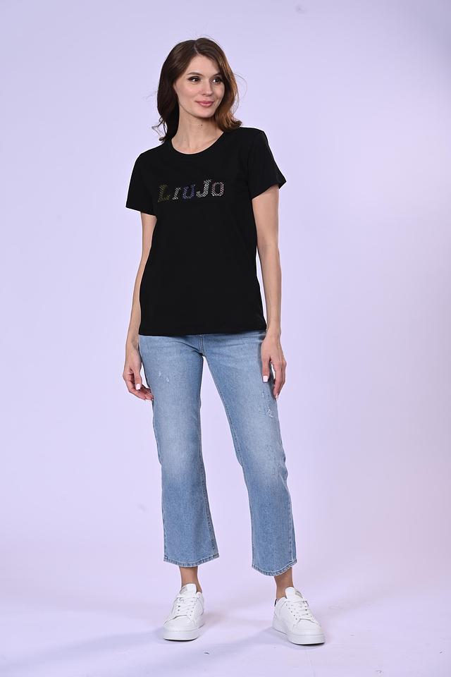 Чёрная футболка Liu-Jo с эффектным декором из страз в виде логотипа бренда. Изготовлена из 100% хлопка, обеспечивая комфорт и удобство в носке. Стильный и лаконичный дизайн делает эту футболку универсальным элементом гардероба. Состав: хлопок 100%