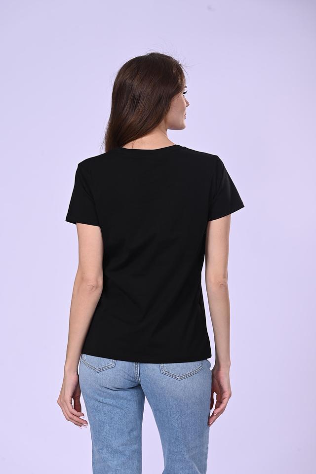 Основной цвет футболки – чёрный, который легко сочетается с другими элементами гардероба. Главной особенностью модели является декоративный логотип бренда, выполненный из мерцающих страз. Этот акцент придает футболке изысканность и привлекательность.