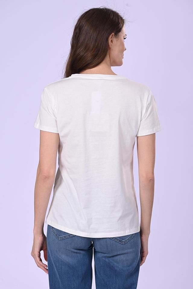 Основной цвет футболки – белый, что делает ее универсальной и легко сочетаемой с другими элементами одежды. Передняя часть футболки украшена логотипом бренда, выполненным с использованием мерцающих элементов, что придает ей особый шарм и изысканность.