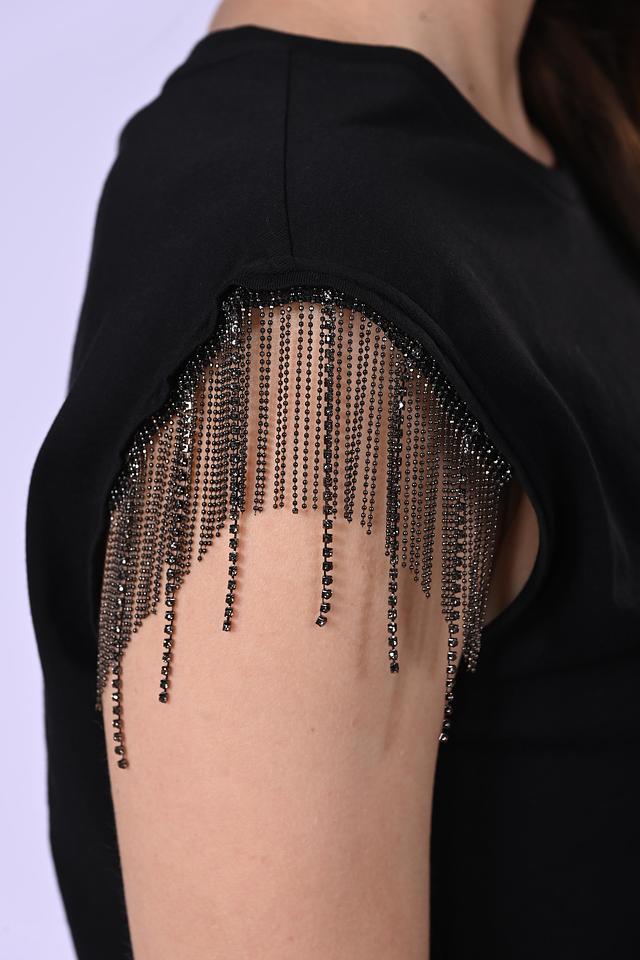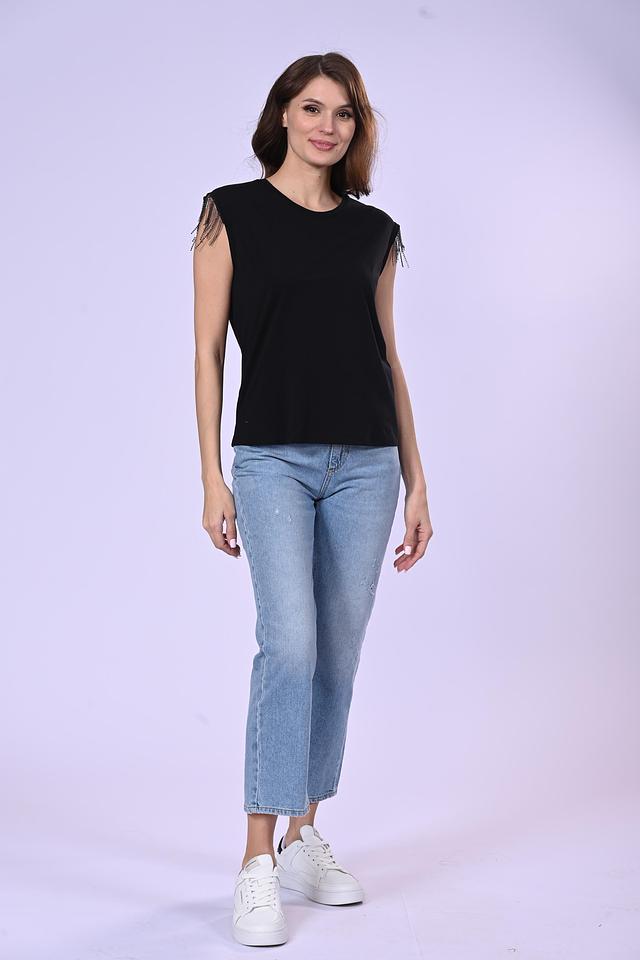 Особенностью данной модели является декор в виде бахромы на плечах, который придает ей оригинальность и выразительность. Футболка имеет классический круглый вырез горловины и короткие рукава-трапеции.