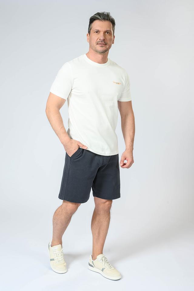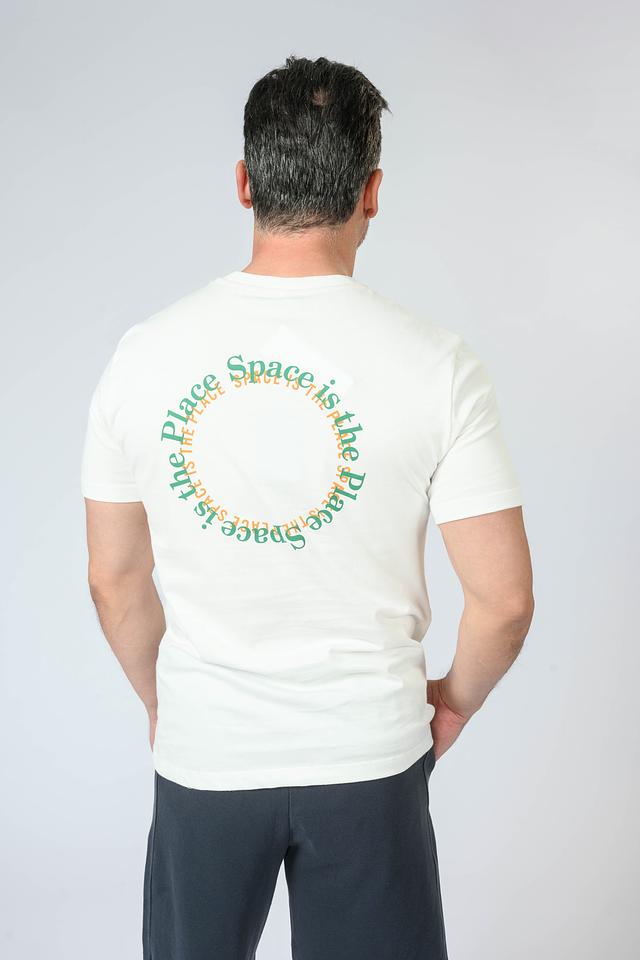 Футболка имеет классический крой и круглый вырез горловины. Передняя часть украшена небольшим принтом с логотипом бренда и надписью, а задняя – крупным графическим рисунком. Такой дизайн придает футболке индивидуальность и современный вид.