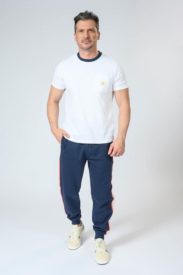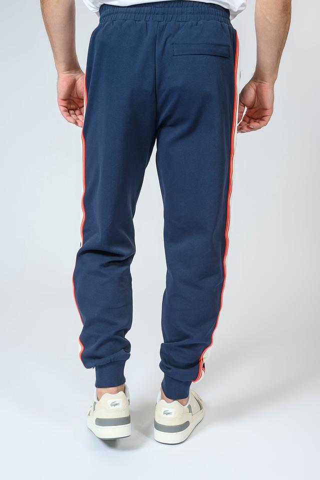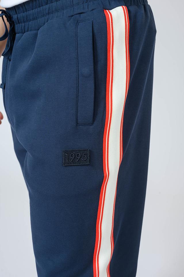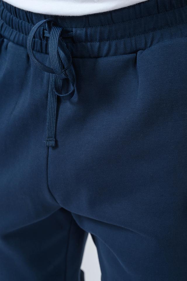 Брюки имеют эластичный пояс с регулируемым шнурком, обеспечивающим надежную фиксацию. По бокам расположены контрастные полоски красного и белого цветов, добавляющие динамичности образу. Материал – мягкий хлопок с небольшим добавлением эластана, что обеспечивает комфорт и свободу движений.