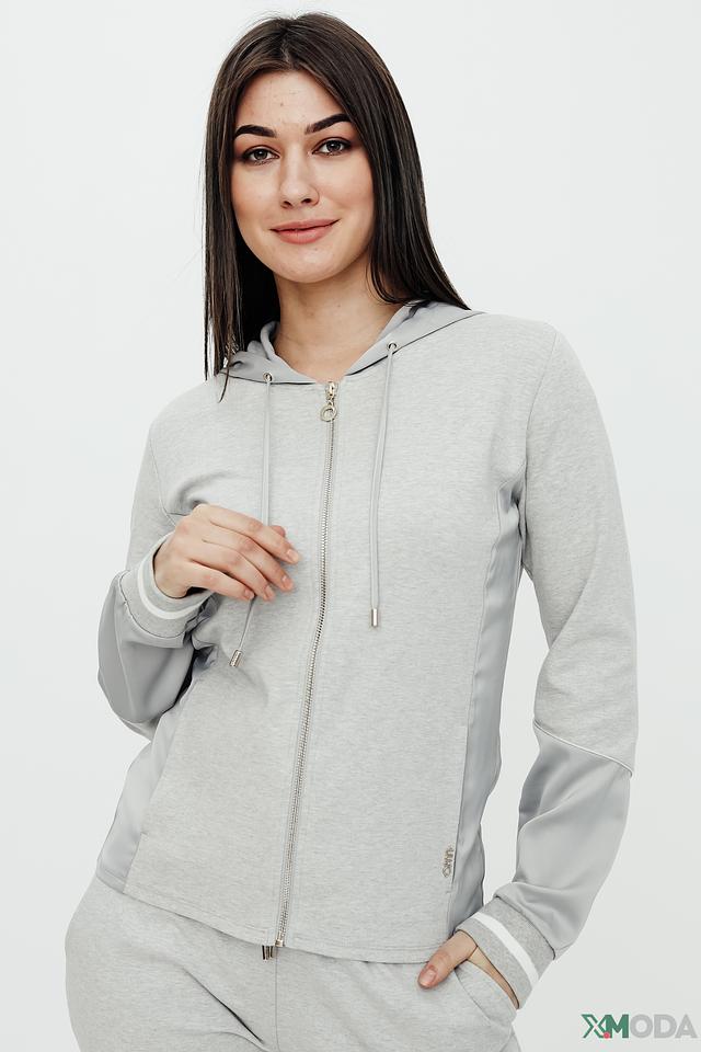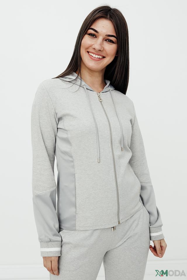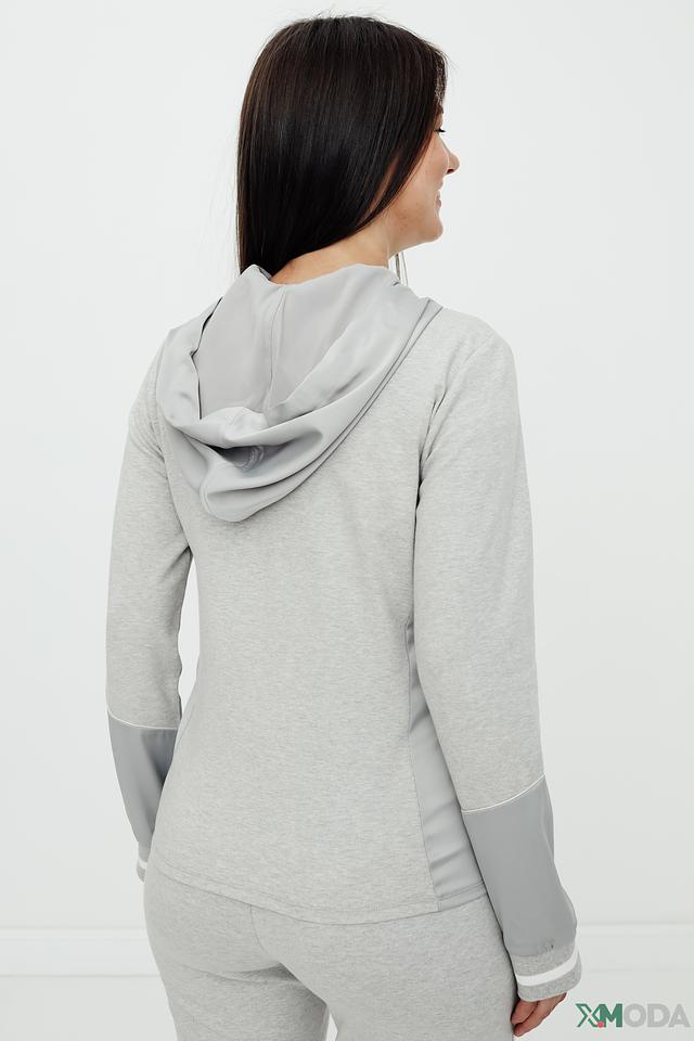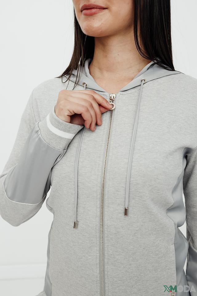 Толстовка имеет удобную застежку-молнию, капюшон и длинные рукава. Боковые вставки и манжеты выполнены в более светлом оттенке серого, что добавляет модели оригинальности. Материал – хлопок с небольшим добавлением эластана, что обеспечивает мягкость, приятные тактильные ощущения и хорошую посадку по фигуре.