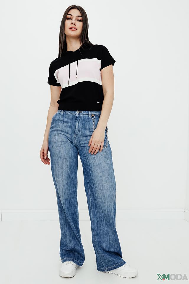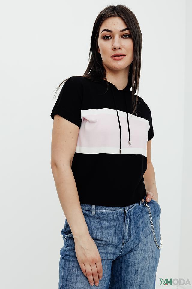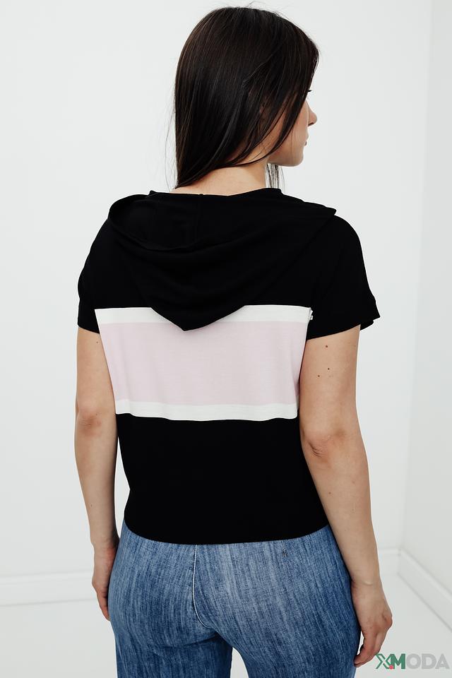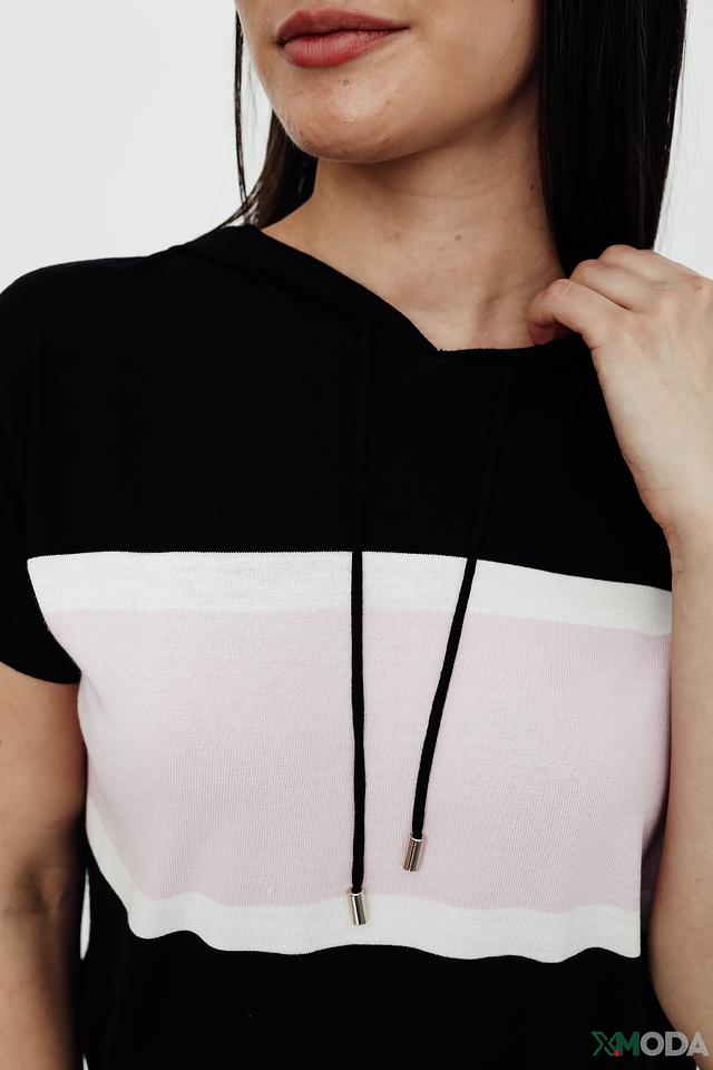 Женский джемпер Liu-Jo чёрного цвета с короткими рукавами и декоративной полоской в розово-бежевой гамме. Модель дополнена капюшоном и шнурками. Идеальный выбор для создания стильного и комфортного образа. Состав: вискоза 85%, эластан 15%