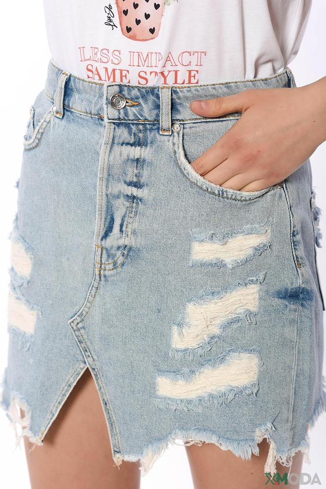 Юбка имеет светло-голубой цвет и отличается оригинальным дизайном с рваными элементами и асимметричным кроем. Высокая посадка подчеркивает талию, а короткая длина придает образу легкость и кокетство.