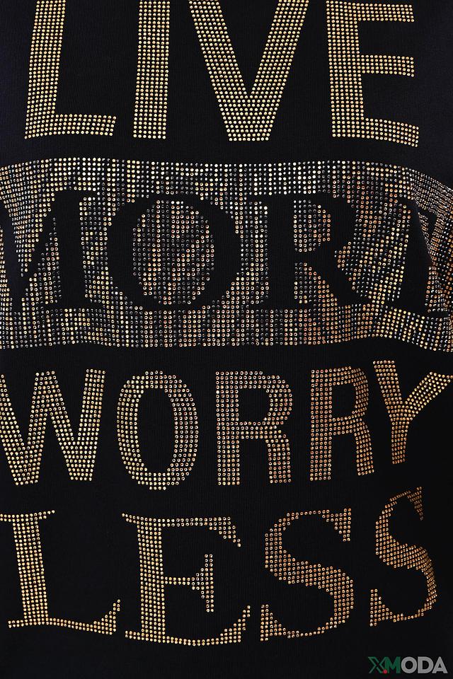 Основным акцентом модели является яркая надпись "LIVE MORE WORRY LESS", выполненная с использованием множества сверкающих страз. Этот декор придает джемперу особый шарм и привлекает внимание.