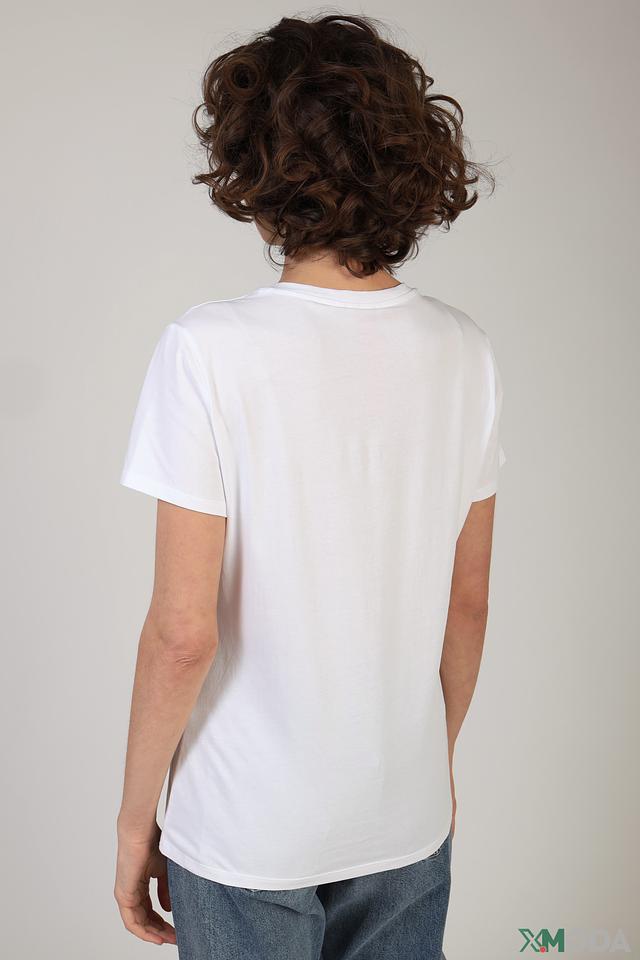 Футболка имеет классический прямой крой и короткие рукава. Она идеально подходит для создания повседневных образов, сочетаясь с джинсами, шортами или юбками. Состав: 95% хлопок, 5% эластан.