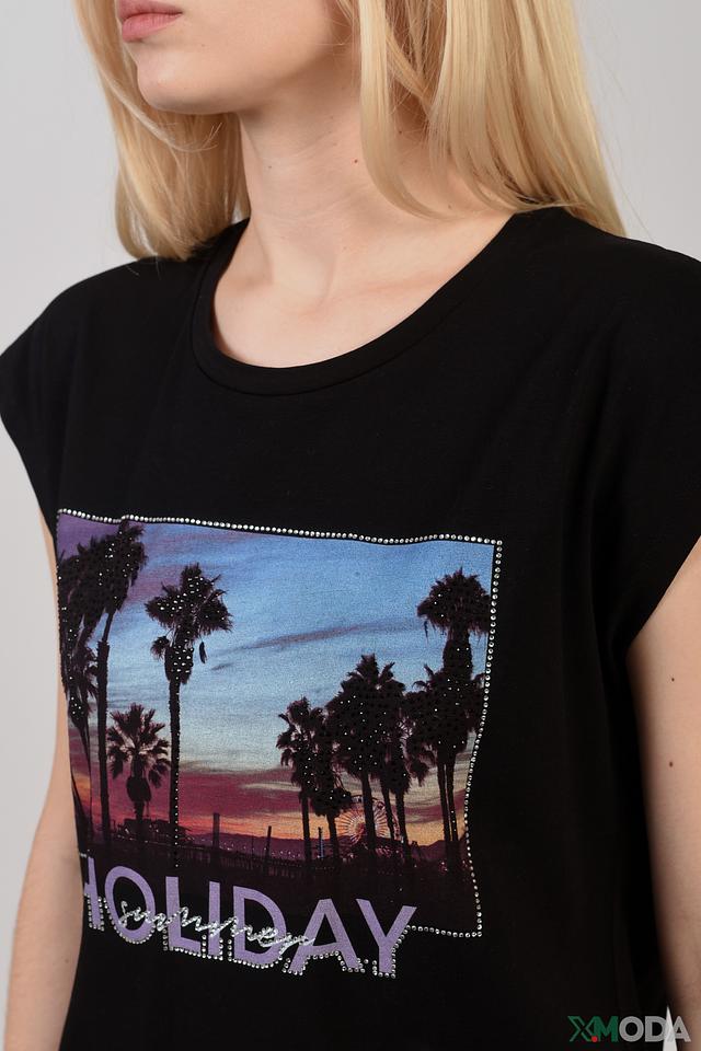 Основной цвет футболки – чёрный, который служит идеальным фоном для яркого и привлекательного принта "Holiday". Принт выполнен в виде изображения пальм на фоне заката и надписи "HOLIDAY", выполненной в сочетании цветов.