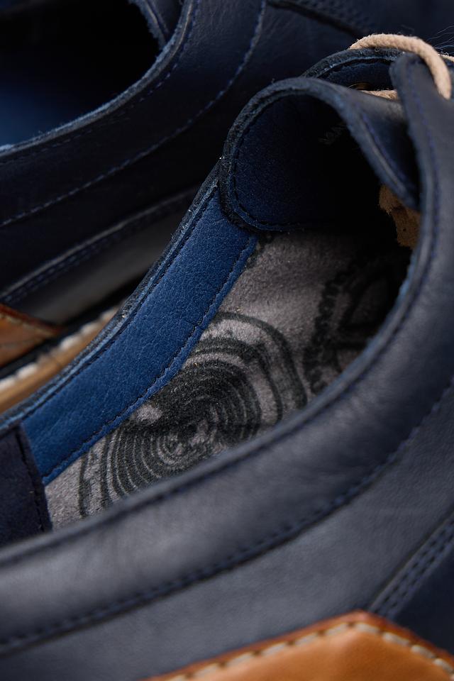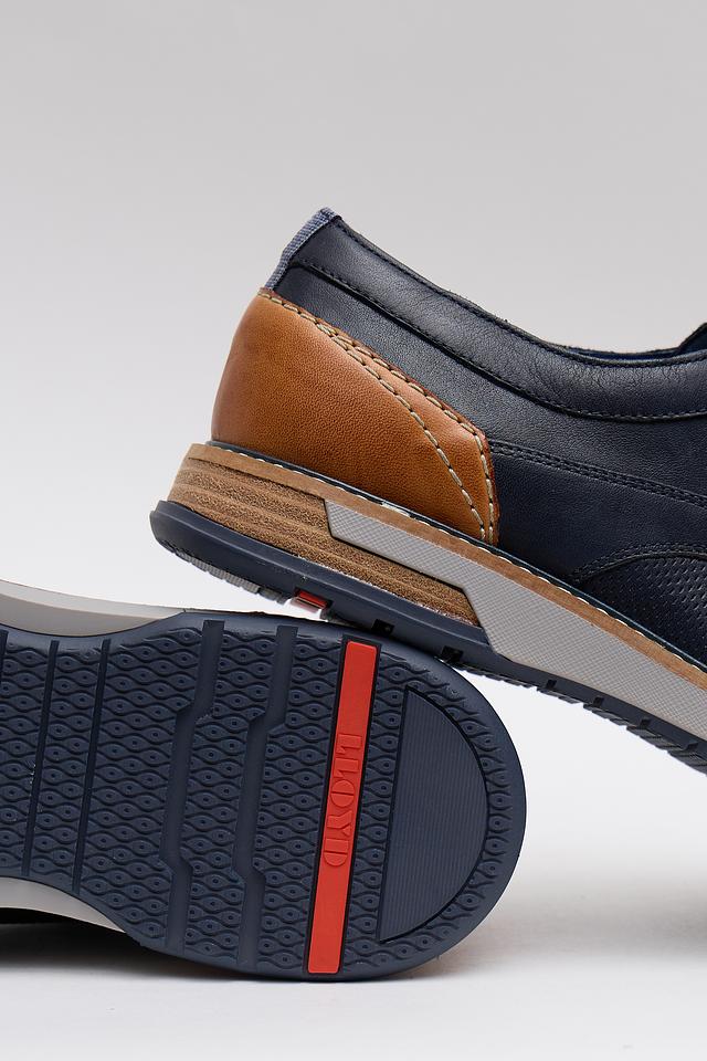 Дизайн туфель сочетает в себе классический стиль и современные элементы. Отличительной особенностью является комбинация синего и коричневого цветов, а также перфорация на основной части. Резиновая подошва обеспечивает хорошее сцепление с поверхностью и амортизацию.