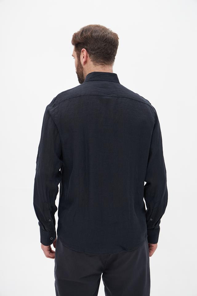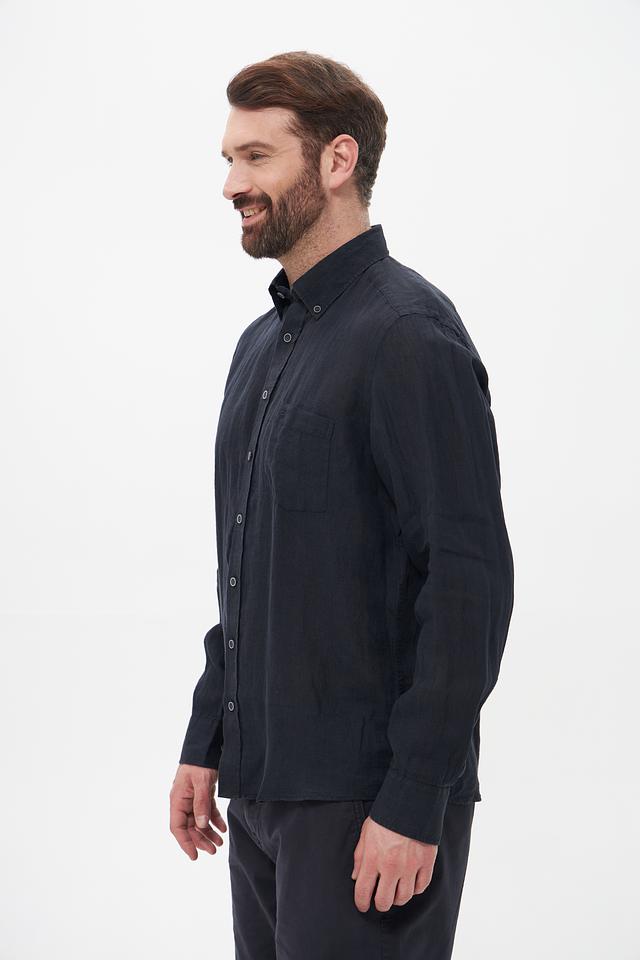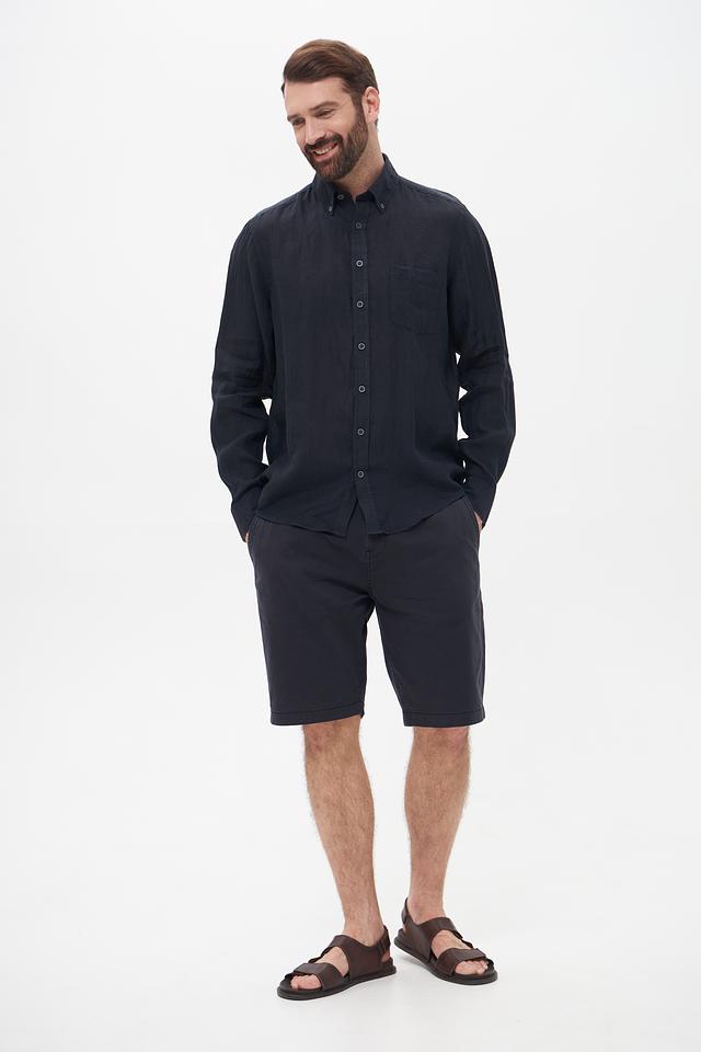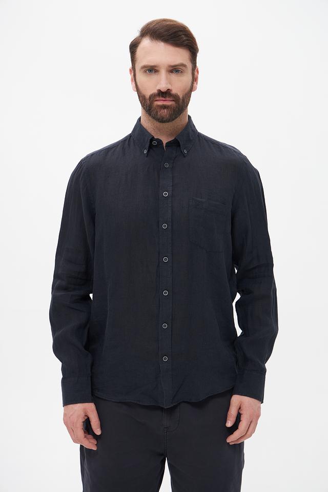 Темно-синий цвет рубашки делает ее универсальной и легко сочетаемой с различными элементами гардероба – от брюк и джинсов до шорт. Эта рубашка станет прекрасным дополнением к вашему повседневному или casual стилю. Льняная ткань придает рубашке слегка мятый вид, что подчеркивает ее натуральность и непринужденность.