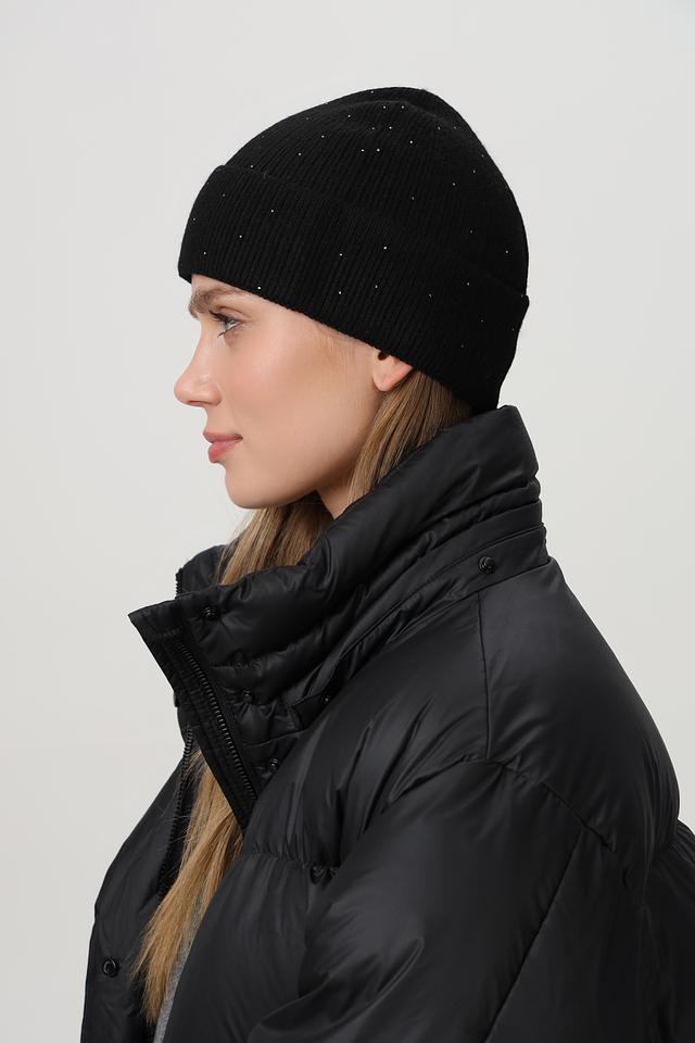 Особый шарм этой шапке придаёт декор в виде мелких страз, аккуратно расположенных по всей поверхности. Также на шапке присутствует небольшой металлический логотип бренда. Шапка плотно прилегает к голове, надёжно защищая от холода и ветра.