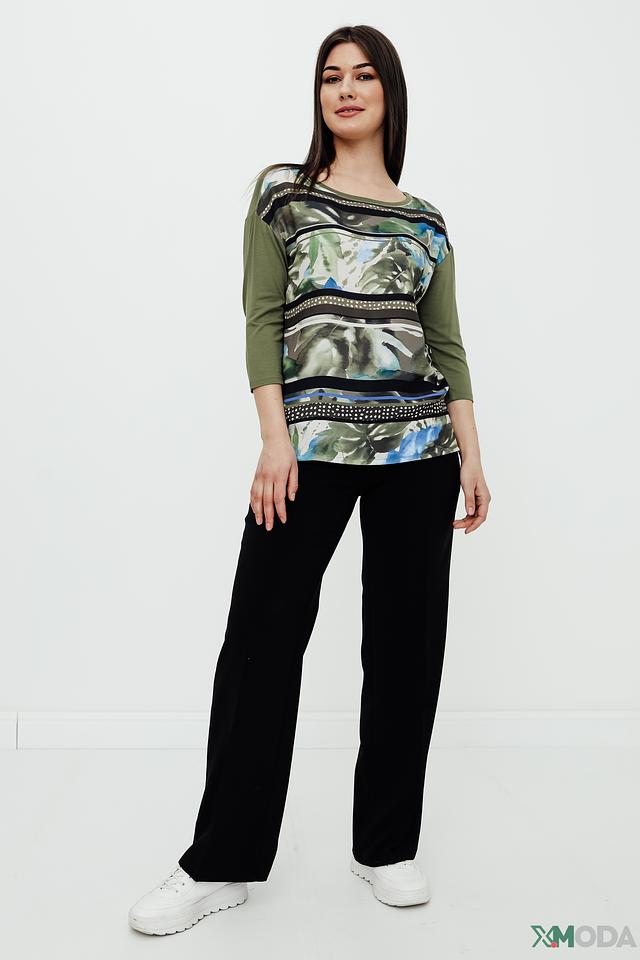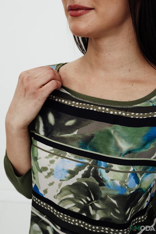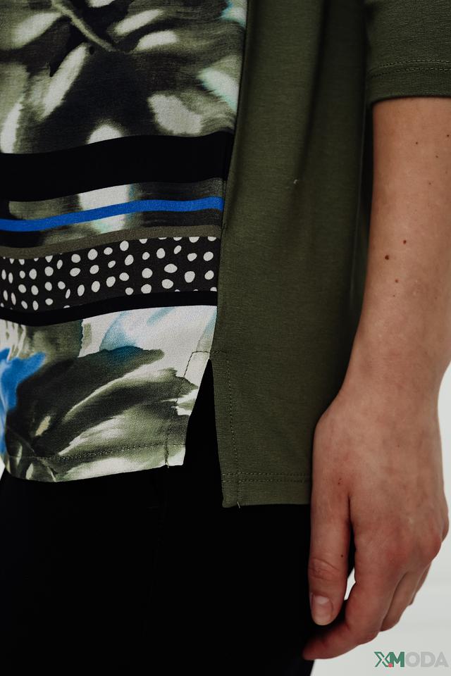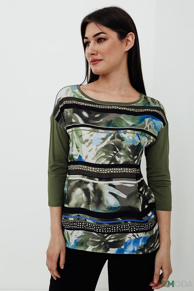 Женский лонгслив Betty Barclay оливкового цвета с ярким цветочным принтом. Модель выполнена из мягкой вискозы с добавлением эластана, обеспечивающего комфортную посадку по фигуре. Состав: вискоза 95%, эластан 5%