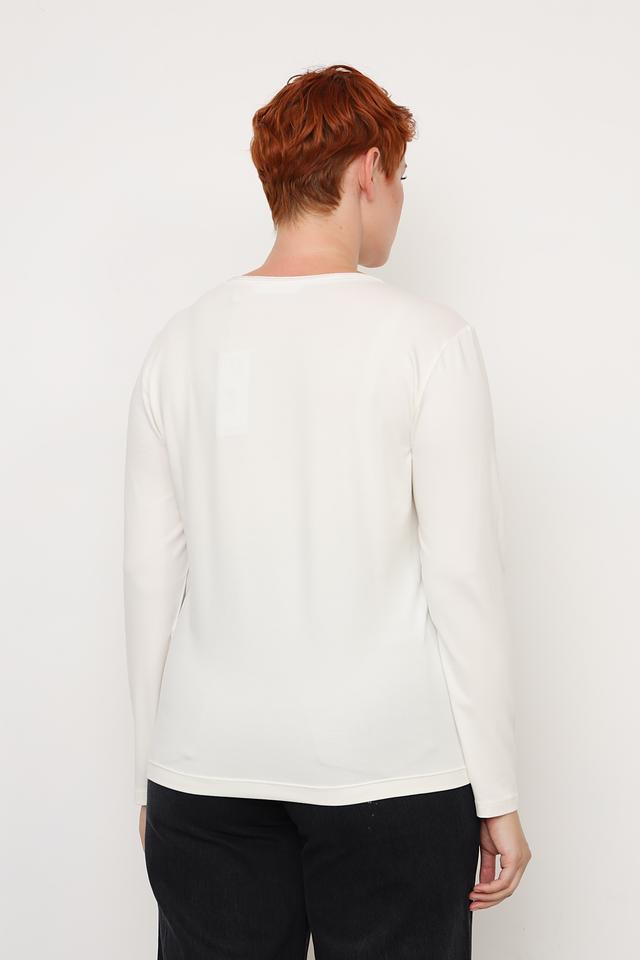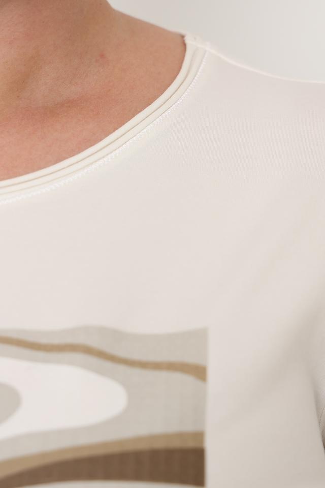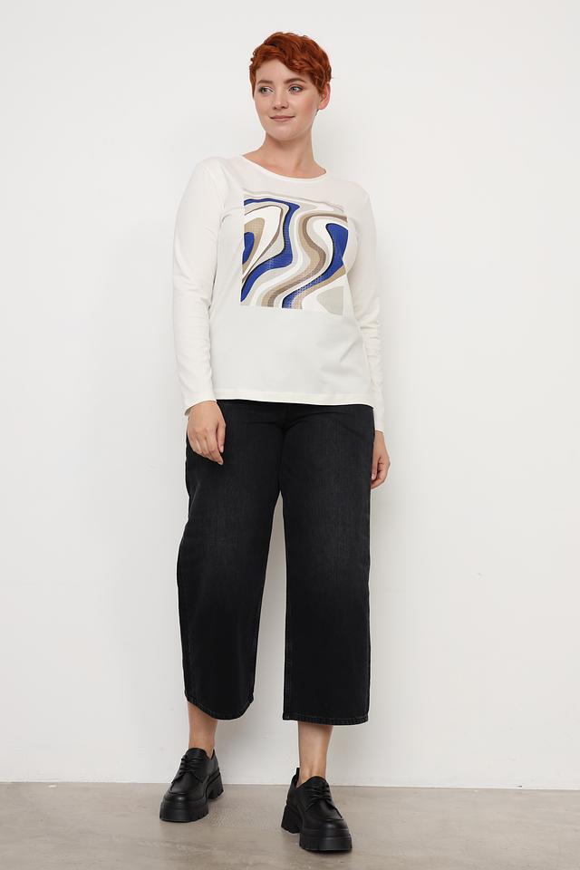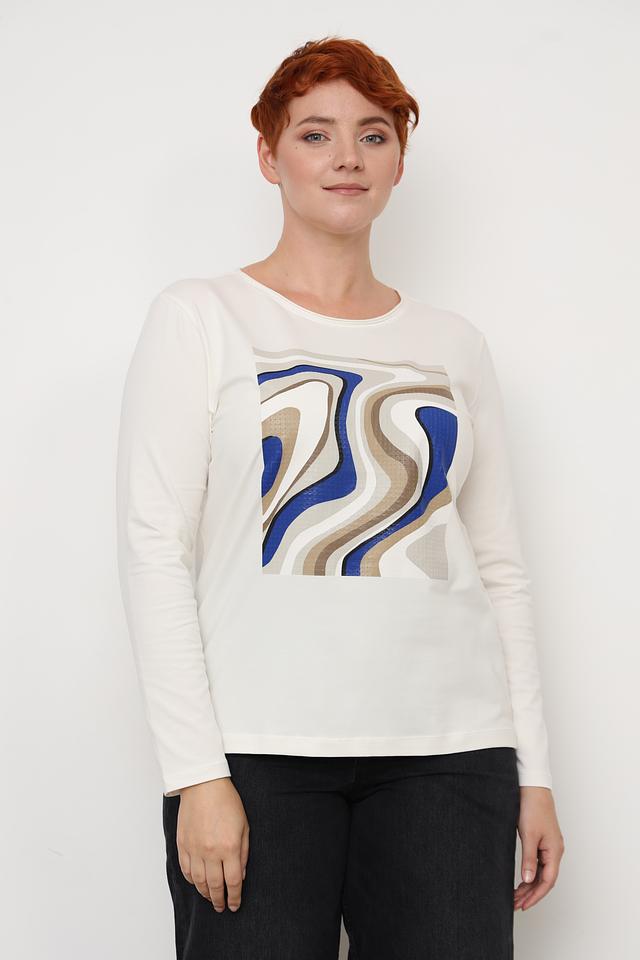 Женский лонгслив Bianca кремового цвета с оригинальным абстрактным принтом. Изготовлен из мягкого хлопка с добавлением эластана для комфортной посадки и свободы движений. Идеально подходит для создания стильных повседневных образов. Состав: хлопок 92%, эластан 8%
