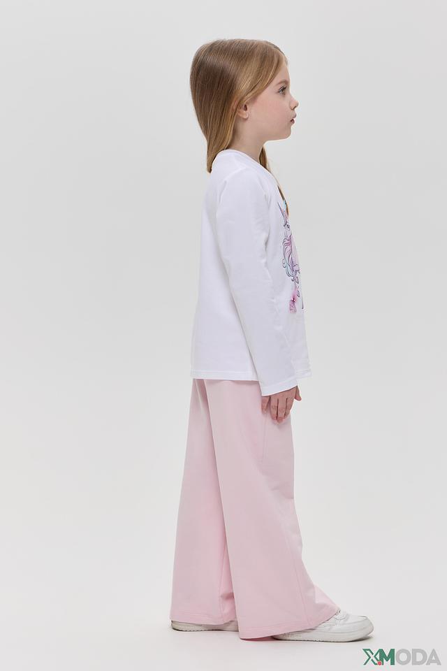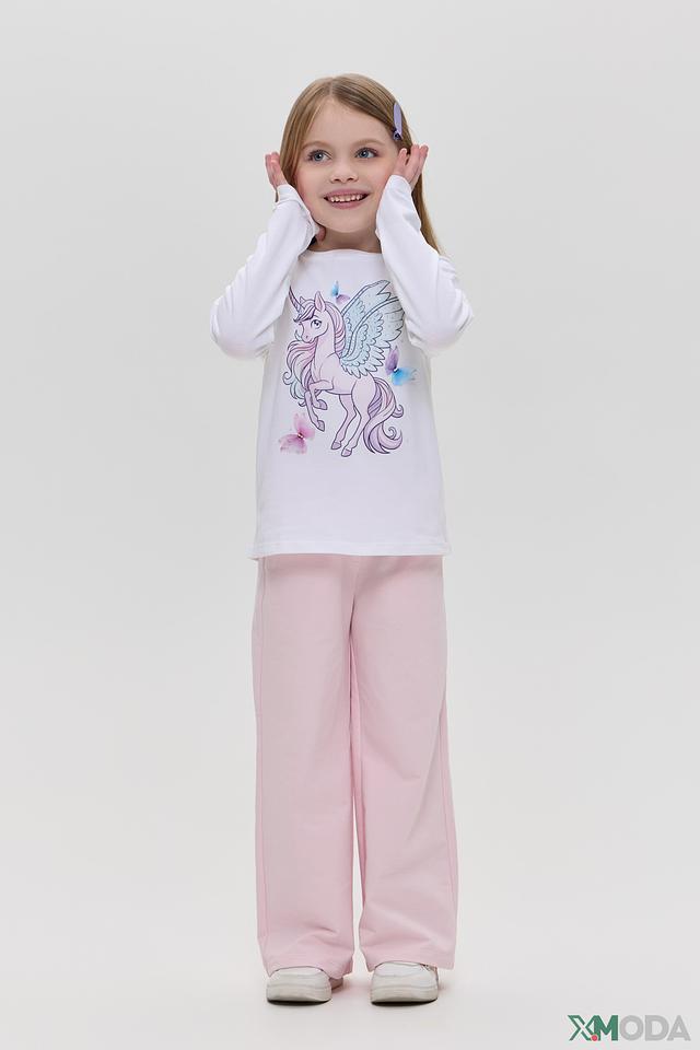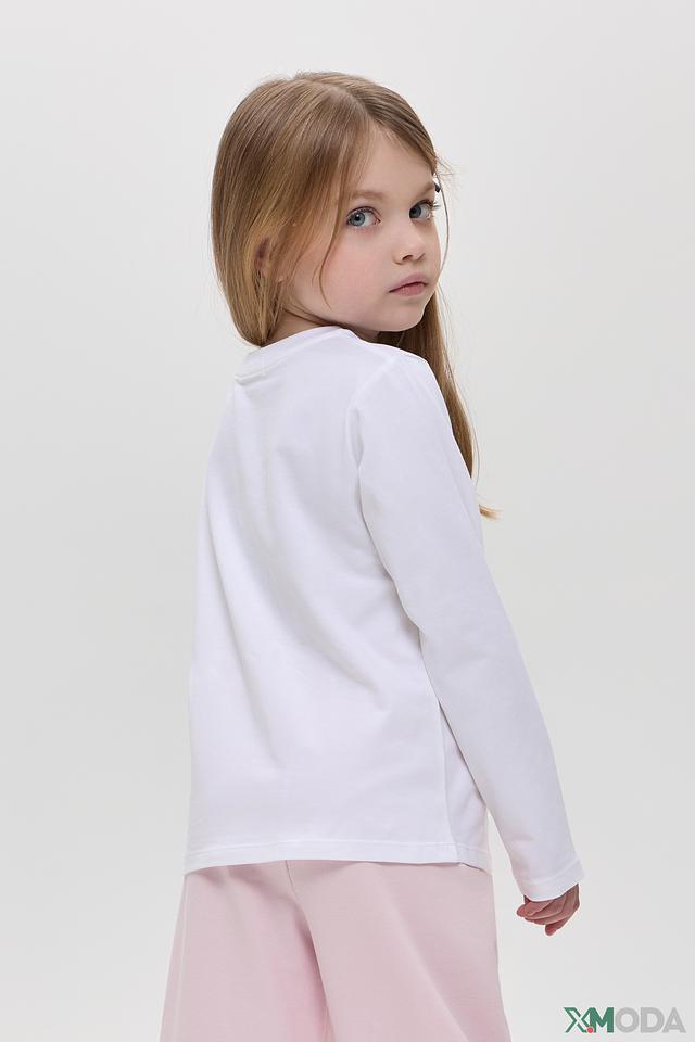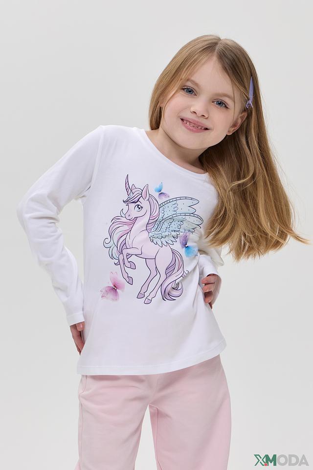 Футболка для девочки украшена ярким и красочным принтом с единорогом, который непременно понравится каждой маленькой моднице. Белый лонгслив идеально сочетается с любым низом, позволяя создавать разнообразные образы.