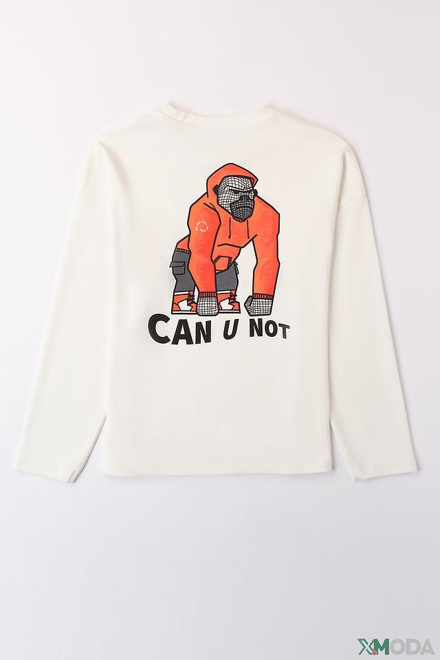 Джемпер имеет длинные рукава и круглый вырез горловины. Главная особенность модели – яркий принт с изображением обезьянки в оранжевой толстовке, выполненный на передней части изделия. Принт дополнен надписями в уличном стиле.