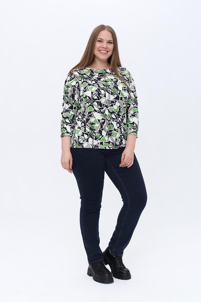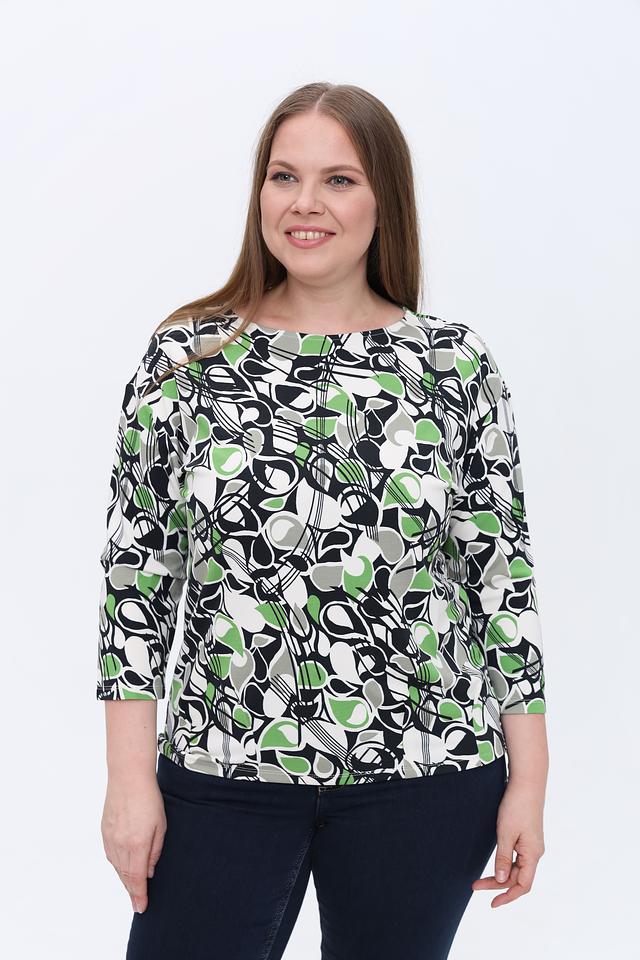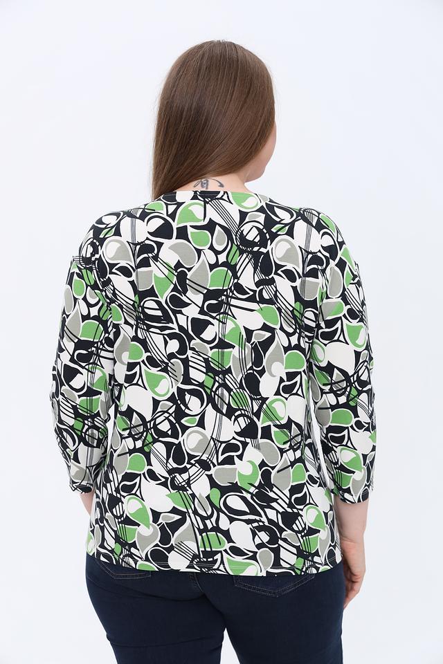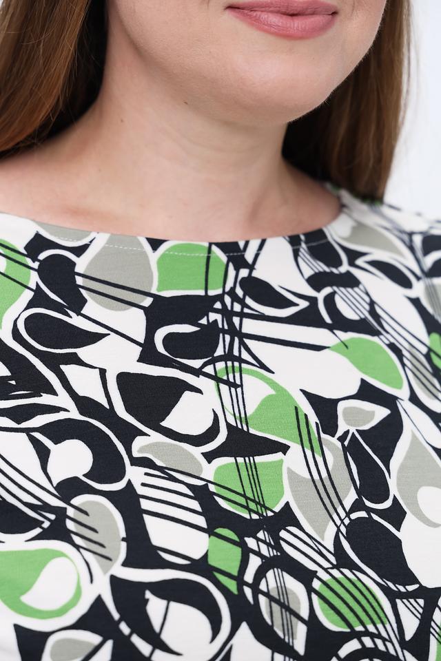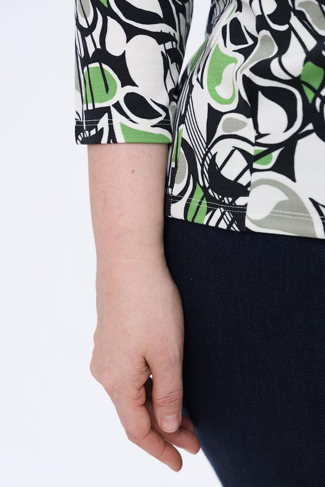 Лонгслив имеет округлый вырез горловины и длинные рукава. Его особенностью является яркий и оригинальный абстрактный принт, выполненный в сочетании зелёных, серых и чёрных оттенков на белом фоне. Такой рисунок добавит образу динамичности и индивидуальности.