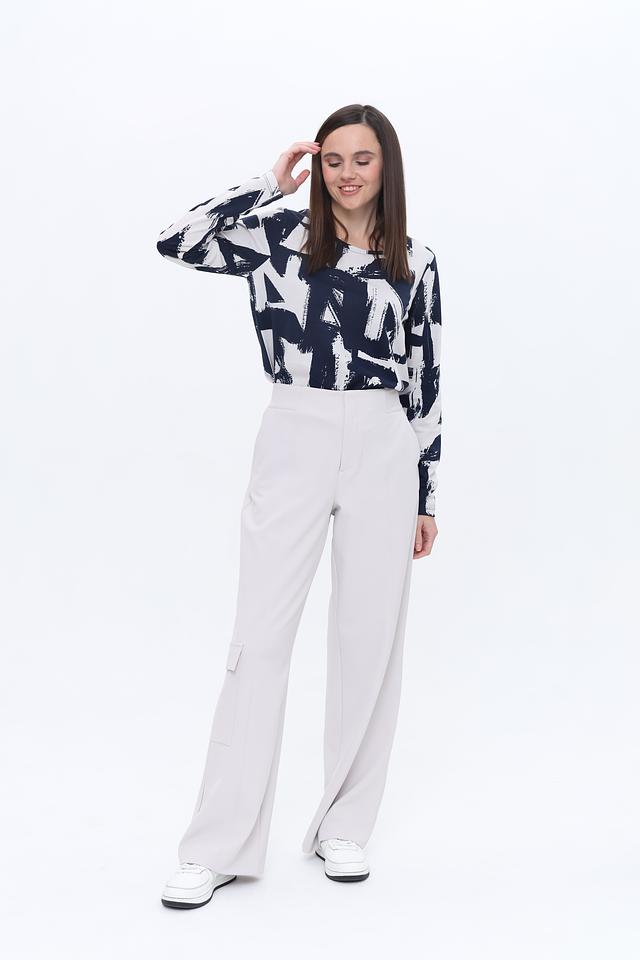 Лонгслив имеет прямой крой и длинные рукава, что делает его идеальным для прохладной погоды. Основной цвет изделия – глубокий синий, который эффектно контрастирует с белым абстрактным принтом, создавая яркий и запоминающийся образ.