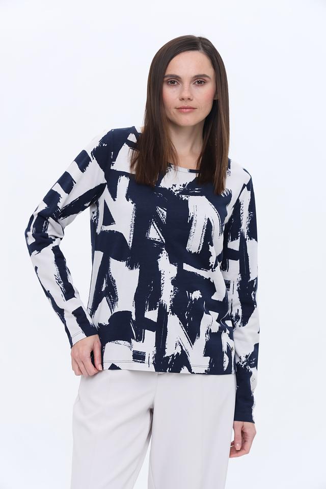Женский лонгслив Monari синего цвета с оригинальным белым абстрактным принтом. Изготовлен из мягкого и приятного к телу сочетания хлопка и модала, обеспечивающего комфорт в носке. Стильный и универсальный выбор для создания повседневных образов. Состав: хлопок 50%, модал 50%
